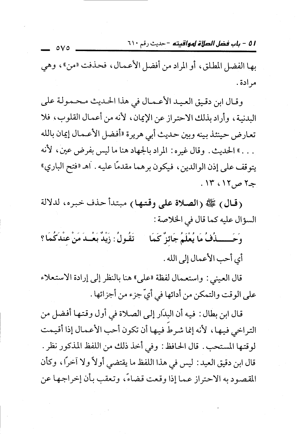 وقال ابن دقيق العيد الأعمال في هذا الحديث محمولة على البدنية، وأراد بذلك الاحتراز عن الإيمان، لأنه من أعمال القلوب، فلا تعارض حينئذ بينه وبين حديث أبي هريرة "أفضل الأعمال إيمان بالله ... " الحديث. وقال غيره: المراد بالجهاد هنا ما ليس بفرض عين، لأنه يتوقف على إذن الوالدين، فيكون برهما مقدمًا عليه. اهـ "فتح الباري"