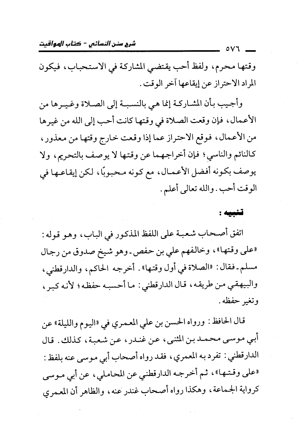 قال الحافظ: ورواه الحسن بن علي المعمري في "اليوم والليلة" عن أبي موسى محمد بن المثنى، عن غندر، عن شعبة، كذلك. قال الدارقطني: تفرد به المعمري، فقد رواه أصحاب أبي موسى عنه بلفظ: "على وقتها"، ثم أخرجه الدارقطني عن المحاملي، عن أبي موسى كرواية الجماعة، وهكذا رواه أصحاب غندر عنه، والظاهر أن المعمري