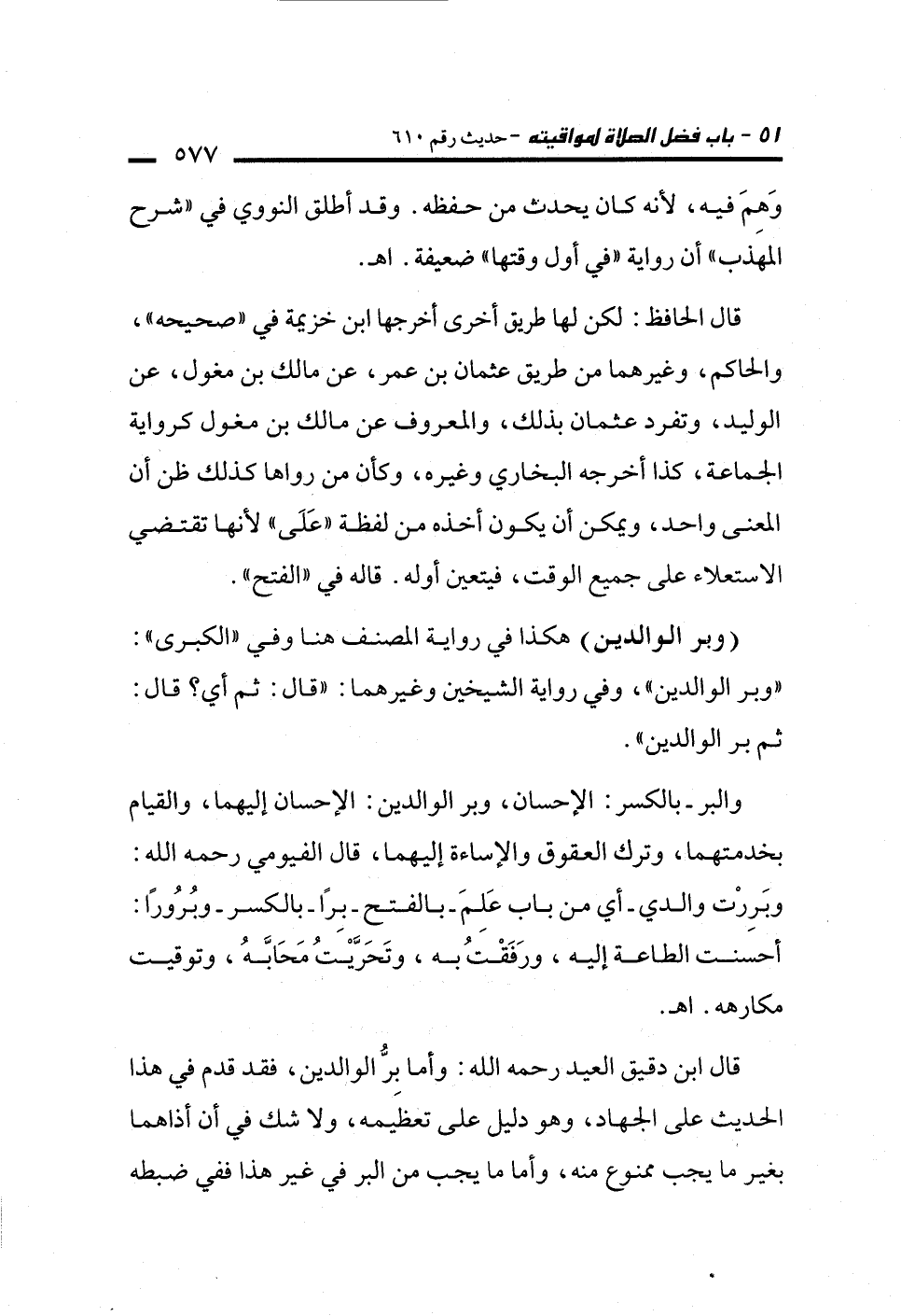 قال ابن دقيق العيد رحمه الله: وأما بِرُّ الوالدين، فقد قدم في هذا الحديث على الجهاد، وهو دليل على تعظيمه، ولا شك في أن أذاهما بغير وما يجب ممنوع منه، وأما ما يجب من البر في غير هذا ففي ضبطه