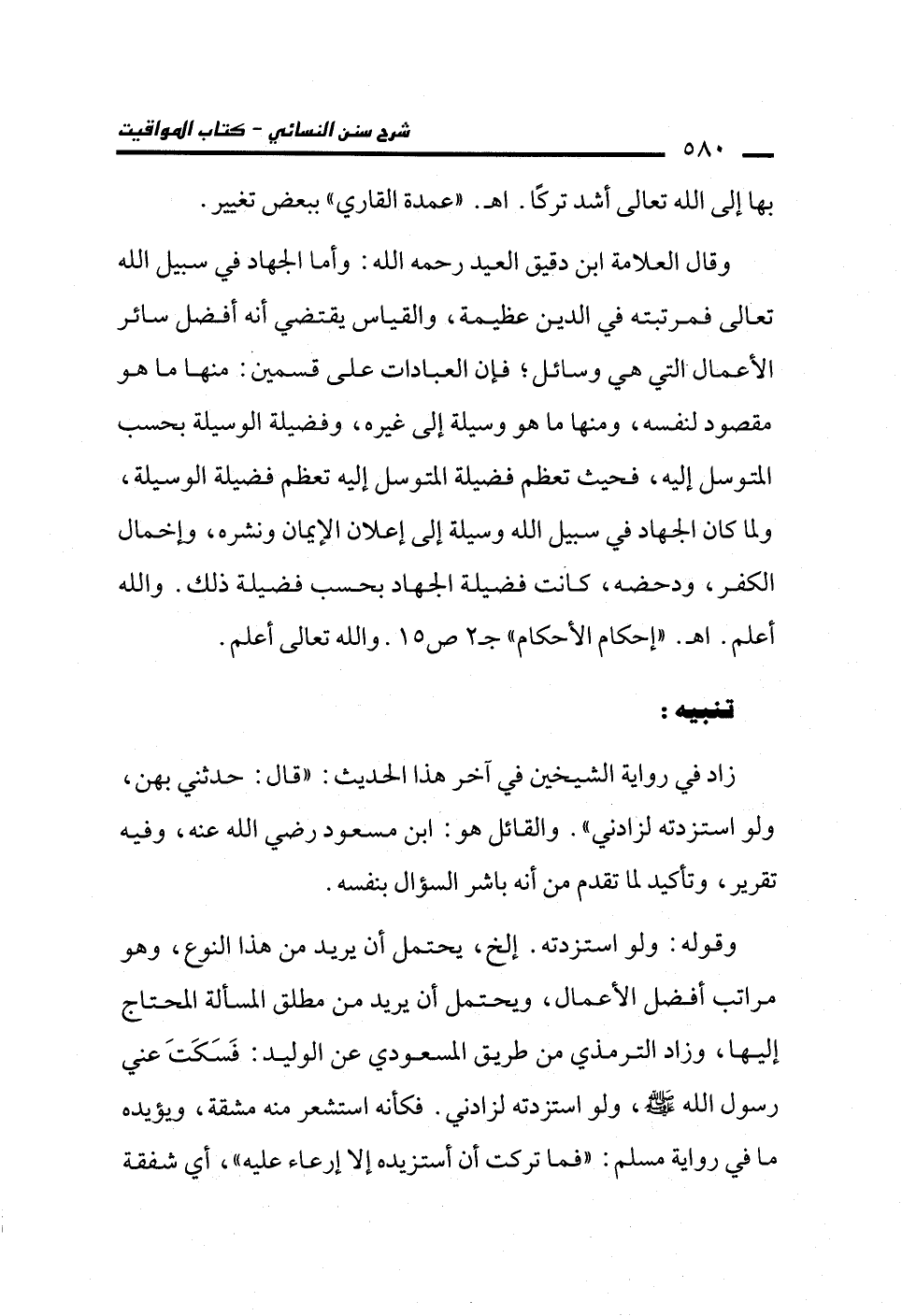 وقال العلامة ابن دقيق العيد رحمه الله: وأما الجهاد في سبيل الله تعالى فمرتبته في الدين عظيمة، والقياس يقتضي أنه أفضل سائر الأعمال التي هي وسائل؛ فإن العبادات على قسمين: منها ما هو مقصود لنفسه، ومنها ما هو وسيلة إلى غيره، وفضيلة الوسيلة بحسب المتوسل إليه، فحيث تعظم فضيلة المتوسل إليه تعظم فضيلة الوسيلة، ولما كان الجهاد في سبيل الله وسيلة إلى إعلان الإيمان ونشره، وإخمال الكفر، ودحضه، كانت فضيلة الجهاد بحسب فضيلة ذلك. والله أعلم. اهـ. "إحكام الأحكام" جـ 2 ص 15. والله تعالى أعلم.