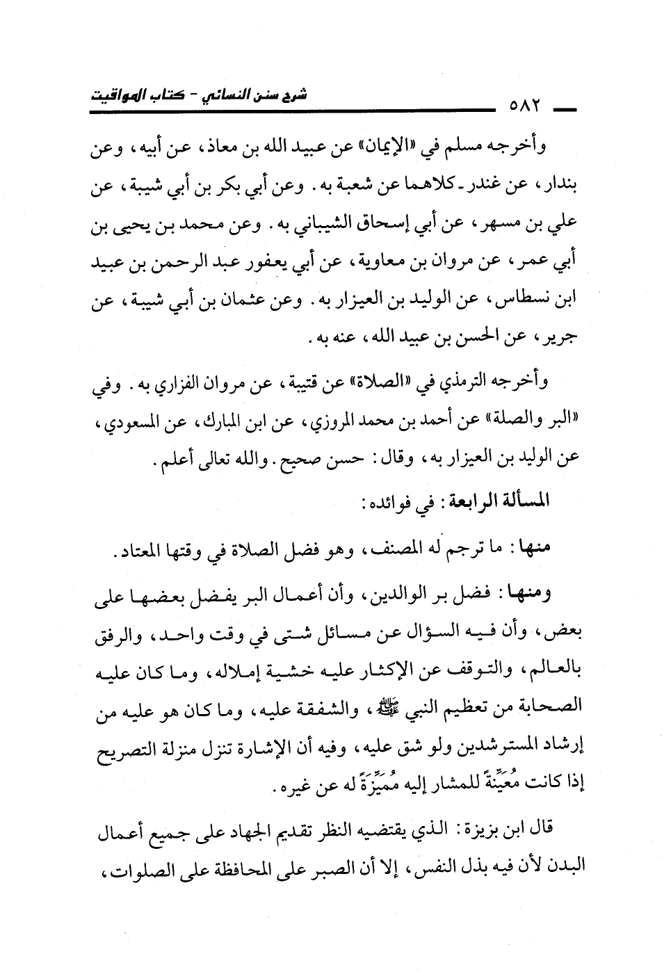 وأخرجه الترمذي في "الصلاة" عن قتيبة، عن مروان الفزاري به. وفي "البر والصلة" عن أحمد بن محمد المروزي، عن ابن البارك، عن المسعودي، عن الوليد بن العيزار به، وقال: حسن صحيح. والله تعالى أعلم.
