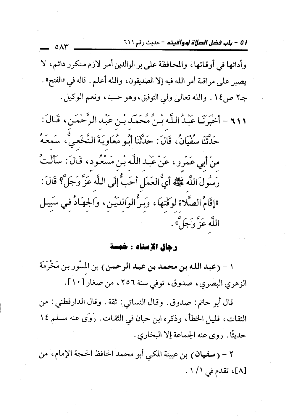 611 - أَخْبَرَنَا عَبْدُ اللهِ بْنُ مُحَمَّدِ بْنِ عَبْدِ الرَّحْمَنِ، قَالَ: حَدَّثَنَا سُفْيَانُ، قَالَ: حَدَّثَنَا أَبُو مُعَاوِيَةَ النَّخَعِيُّ، سَمِعَهُ مِنْ أَبِي عَمْرٍو، عَنْ عَبْدِ اللهِ بْنِ مَسْعُودٍ، قَالَ: سَأَلْتُ رَسُولَ اللهِ - صلى الله عليه وسلم - أَيُّ الْعَمَلِ أَحَبُّ إِلَى اللهِ عَزَّ وَجَلَّ؟ قَالَ: "إِقَامُ الصَّلاَةِ لِوَقْتِهَا، وَبِرُّ الْوَالِدَيْنِ، وَالْجِهَادُ فِي سَبِيلِ اللَّهِ عَزَّ وَجَلَّ".