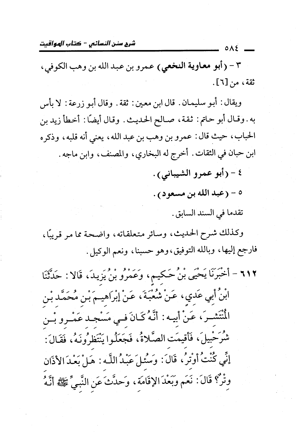 612 - أَخْبَرَنَا يَحْيَى بْنُ حَكِيمٍ، وَعَمْرُو بْنُ يَزِيدَ، قَالاَ: حَدَّثَنَا ابْنُ أَبِي عَدِيٍّ، عَنْ شُعْبَةَ، عَنْ إِبْرَاهِيمَ بْنِ مُحَمَّدِ بْنِ الْمُنْتَشِرِ، عَنْ أَبِيهِ: أَنَّهُ كَانَ فِي مَسْجِدِ عَمْرِو بْنِ شُرَحْبِيلَ، فَأُقِيمَتِ الصَّلاَةُ، فَجَعَلُوا يَنْتَظِرُونَهُ، فَقَالَ: إِنِّي كُنْتُ أُوتِرُ، قَالَ: وَسُئِلَ عَبْدُ اللهِ: هَلْ بَعْدَ الأَذَانِ وِتْرٌ؟ قَالَ: نَعَمْ وَبَعْدَ الإِقَامَةِ، وَحَدَّثَ عَنِ النَّبِيِّ - صلى الله عليه وسلم - أَنَّهُ