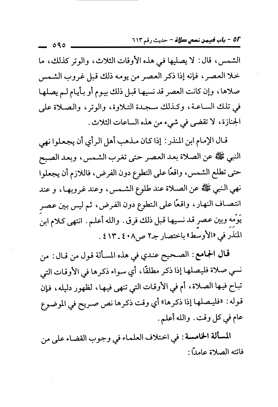 قال الإمام ابن المنذر: إذا كان مذهب أهل الرأي أن يجعلوا نهي النبي - صلى الله عليه وسلم - عن الصلاة بعد العصر حتى تغرب الشمس، وبعد الصبح حتى تطلع الشمس، واقعًا على التطوع دون الفرض، فاللازم أن يجعلوا نهي النبي - صلى الله عليه وسلم - عن الصلاة عند طلوع الشمس، وعند غروبها، وعند انتصاف النهار، واقعًا على التطوع دون الفرض، ثم ليس بين عصرِ يَوْمِهِ وبين عصرٍ قد نسيها قبل ذلك فرق. والله أعلم. انتهى كلام ابن المنذر في "الأوسط" باختصار جـ 2 ص 408 - 413.