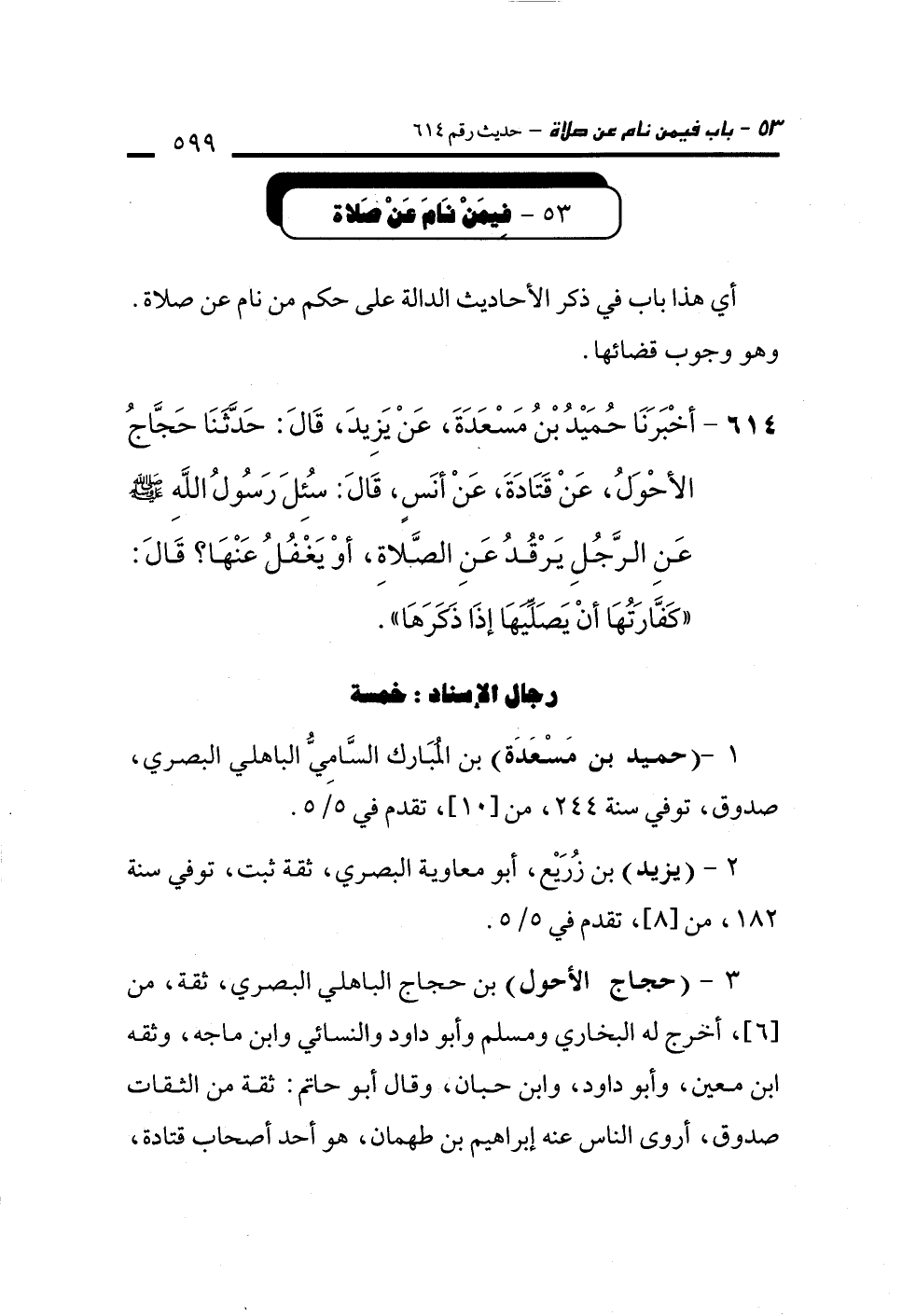 614 - أَخْبَرَنَا حُمَيْدُ بْنُ مَسْعَدَةَ، عَنْ يَزِيدَ، قَالَ: حَدَّثَنَا حَجَّاجٌ الأَحْوَلُ، عَنْ قَتَادَةَ، عَنْ أَنَسٍ، قَالَ: سُئِلَ رَسُولُ اللهِ - صلى الله عليه وسلم - عَنِ الرَّجُلِ يَرْقُدُ عَنِ الصَّلاَةِ، أَوْ يَغْفُلُ عَنْهَا؟ قَالَ: "كَفَّارَتُهَا أَنْ يُصَلِّيَهَا إِذَا ذَكَرَهَا".