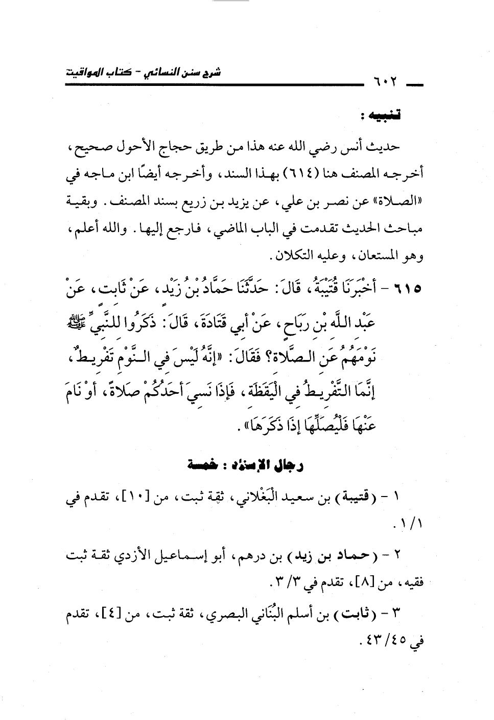 615 - أَخْبَرَنَا قُتَيْبَةُ، قَالَ: حَدَّثَنَا حَمَّادُ بْنُ زَيْدٍ، عَنْ ثَابِتٍ، عَنْ عَبْدِ اللهِ بْنِ رَبَاحٍ، عَنْ أَبِي قَتَادَةَ، قَالَ: ذَكَرُوا لِلنَّبِيِّ - صلى الله عليه وسلم - نَوْمَهُمْ عَنِ الصَّلاَةِ؟ فَقَالَ: "إِنَّهُ لَيْسَ فِي النَّوْمِ تَفْرِيطٌ، إِنَّمَا التَّفْرِيطُ فِي الْيَقَظَةِ، فَإِذَا نَسِيَ أَحَدُكُمْ صَلاَةً، أَوْ نَامَ عَنْهَا فَلْيُصَلِّهَا إِذَا ذَكَرَهَا".