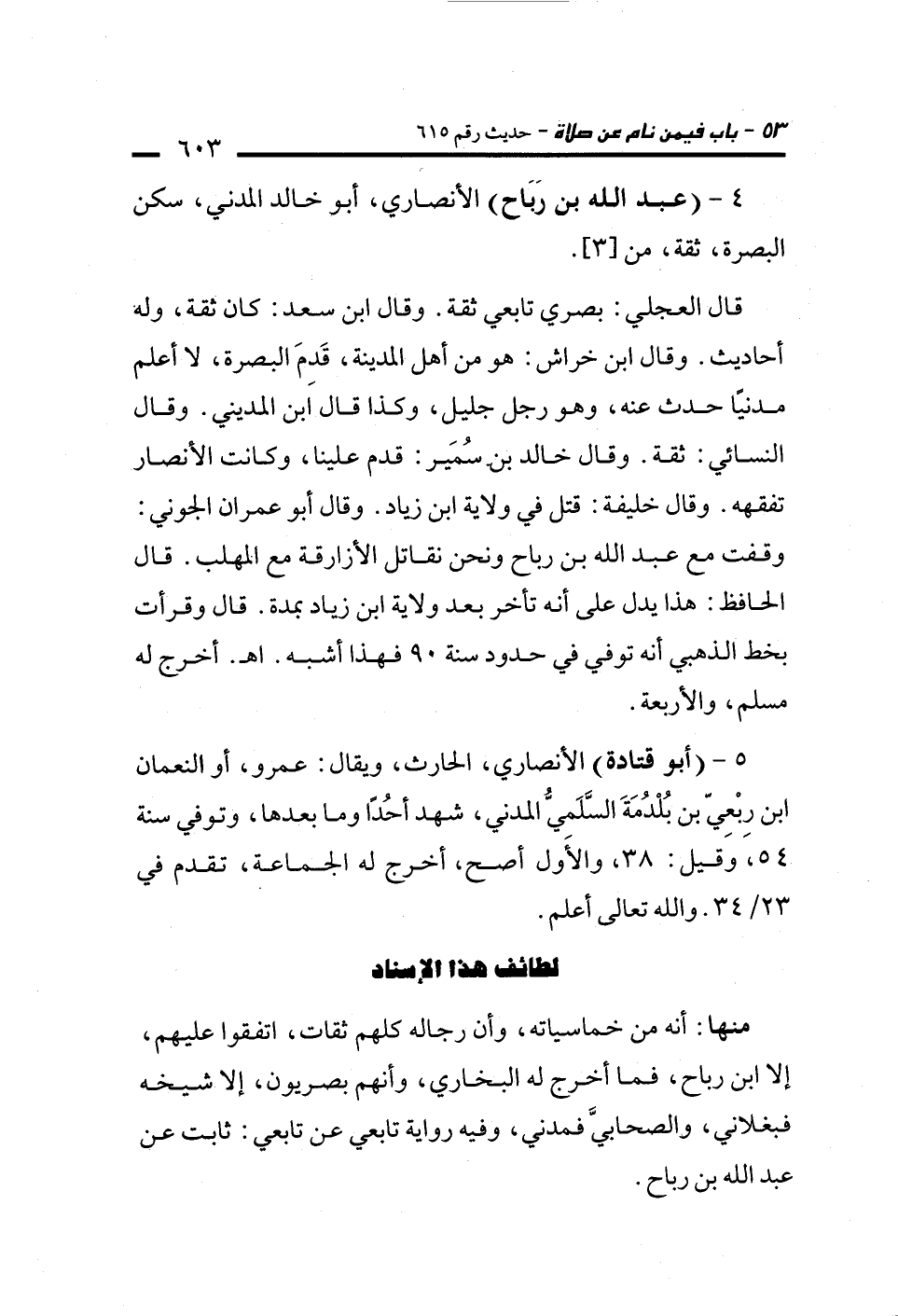 5 - (أبو قتادة) الأنصاري، الحارث، ويقال: عمرو، أو النعمان ابن رِبْعِيّ بن بُلْدُمَةَ السَّلَمِيُّ المدني، شهد أحُدًا وما بعدها، وتوفي سنة 54، وقيل: 38، والأول أصح، أخرج له الجماعة، تقدم في 23/ 34. والله تعالى أعلم.