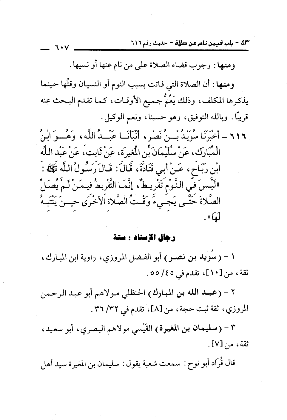 616 - أَخْبَرَنَا سُوَيْدُ بْنُ نَصْرٍ، أَنْبَأَنَا عَبْدُ اللهِ، وَهُوَ ابْنُ الْمُبَارَكِ، عَنْ سُلَيْمَانَ بْنِ الْمُغِيرَةِ، عَنْ ثَابِتٍ، عَنْ عَبْدِ اللهِ بْنِ رَبَاحٍ، عَنْ أَبِي قَتَادَةَ، قَالَ: قَالَ رَسُولُ اللهِ - صلى الله عليه وسلم -: "لَيْسَ فِي النَّوْمِ تَفْرِيطٌ، إِنَّمَا التَّفْرِيطُ فِيمَنْ لَمْ يُصَلِّ الصَّلاَةَ حَتَّى يَجِيءَ وَقْتُ الصَّلاَةِ الأُخْرَى حِينَ يَنْتَبِهُ لَهَا".