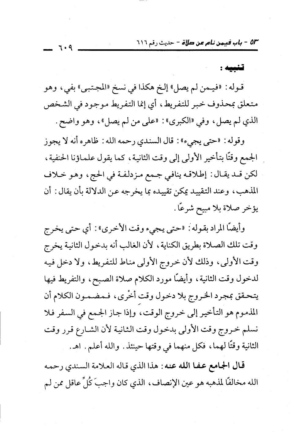 وأيضًا المراد بقوله: "حتى يجيء وقت الأخرى": أي حتى يخرج وقت تلك الصلاة بطريق الكناية، لأن الغالب أنه بدخول الثانية يخرج وقت الأولى، وذلك لأن خروج الأولى مناط للتفريط، ولا دخل فيه لدخول وقت الثانية، وأيضًا مورد الكلام صلاة الصبح، والتفريط فيها يتحقق بمجرد الخروج بلا دخول وقتِ أخْرى، فمضمون الكلام أن المذموم هو التأخير إلى خروج الوقت، وإذا جاز الجمع في السفر فلا نسلم خروج وقت الأولى بدخول وقت الثانية لأن الشارع قرر وقت الثانية وقتًا لهما، فكل منهما في وقتها حينئذ. والله أعلم. اهـ.