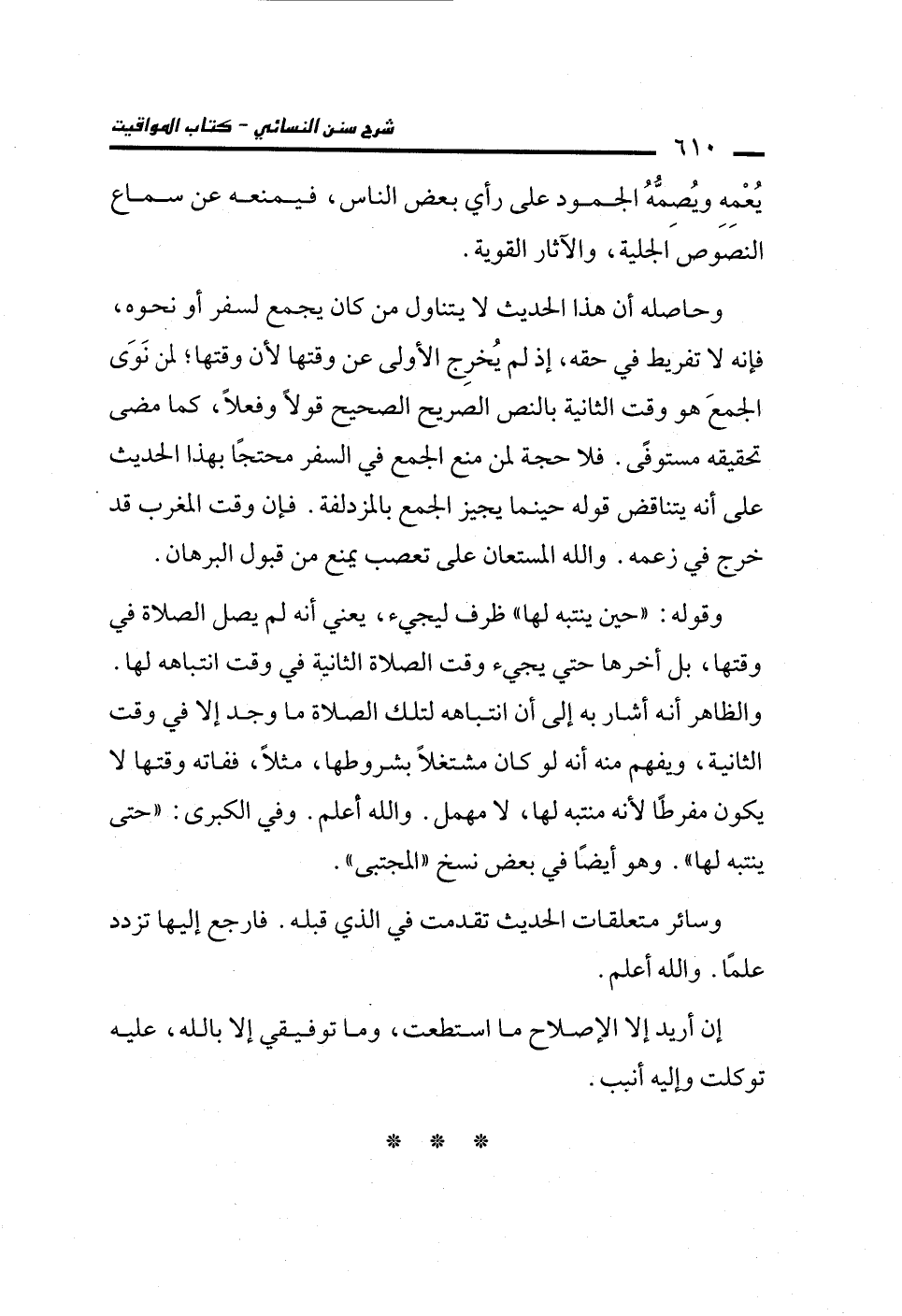 وحاصله أن هذا الحديث لا يتناول من كان يجمع لسفر أو نحوه، فإنه لا تفريط في حقه، إذ لم يُخرِج الأولى عن وقتها لأن وقتها؛ لمن نَوَى الجمعَ هو وقت الثانية بالنص الصريح الصحيح قولًا وفعلًا، كما مضى تحقيقه مستوفًى. فلا حجة لمن منع الجمع في السفر محتجًا بهذا الحديث على أنه يتناقض قوله حينما يجيز الجمع بالمزدلفة. فإن وقت المغرب قد خرج في زعمه. والله المستعان على تعصب يمنع من قبول البرهان.