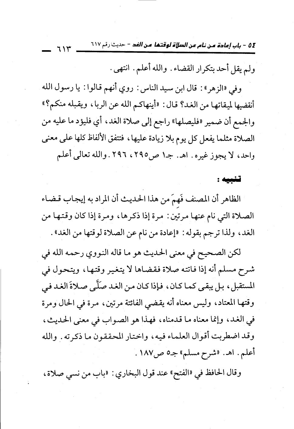 وفي "الزهر": قال ابن سيد الناس: روي أنهم قالوا: يا رسول الله أنقضيها لميقاتها من الغد؟ قال: "أينهاكم الله عن الربا، ويقبله منكم؟ " والجمع أن ضمير "فليصلها" راجع إلى صلاة الغد، أي فليؤد ما عليه من الصلاة مثلما يفعل كل يوم بلا زيادة عليها، فتتفق الألفاظ كلها على معنى واحد، لا يجوز غيره. اهـ. جـ 1 ص 295، 296. والله تعالى أعلم
