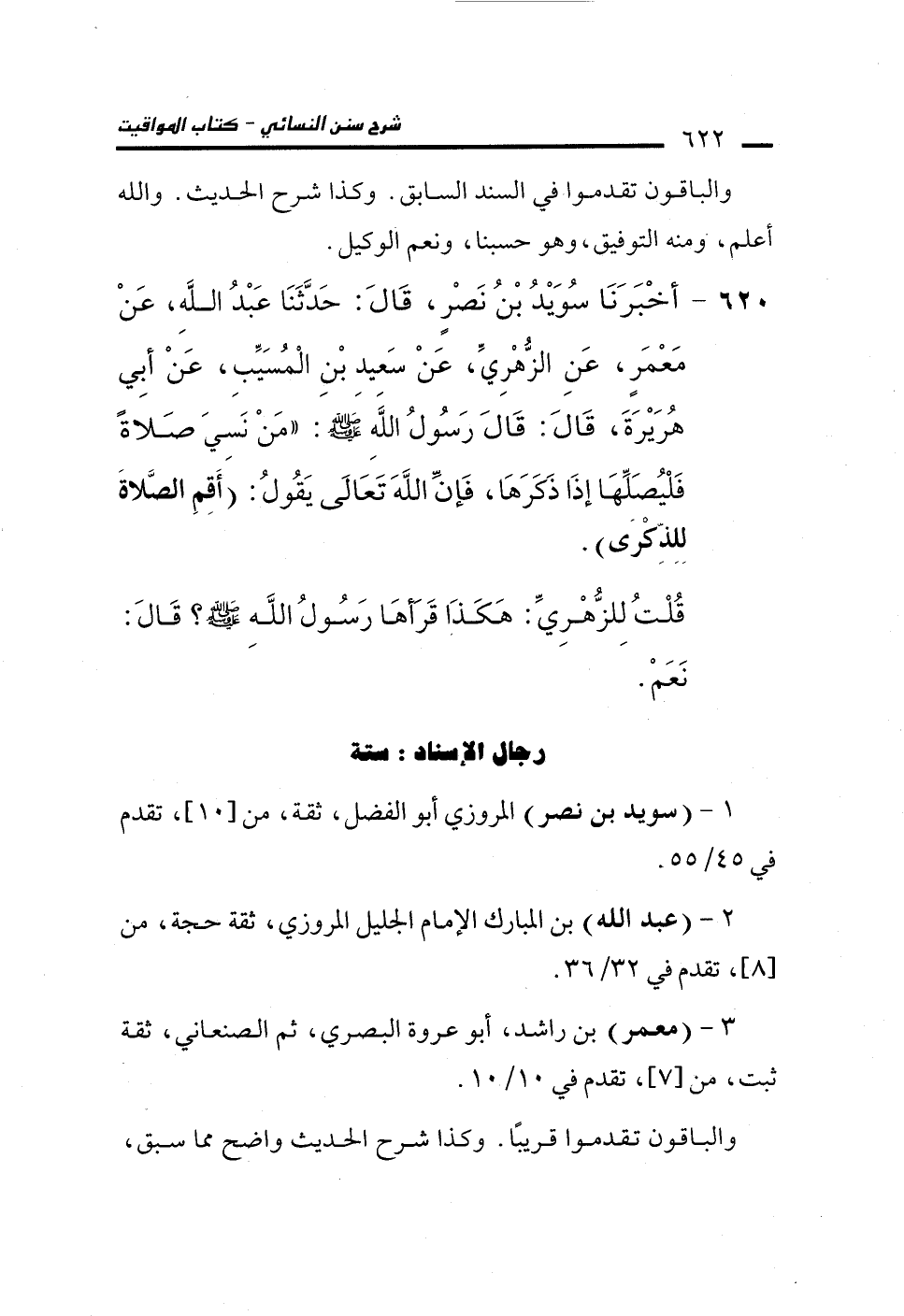620 - أَخْبَرَنَا سُوَيْدُ بْنُ نَصْرٍ، قَالَ: حَدَّثَنَا عَبْدُ اللهِ، عَنْ مَعْمَرٍ، عَنِ الزُّهْرِيِّ، عَنْ سَعِيدِ بْنِ الْمُسَيَّبِ، عَنْ أبِي هُرَيْرَةَ، قَالَ: قَالَ رَسُولُ اللهِ - صلى الله عليه وسلم -: "مَنْ نَسِيَ صَلاَةً فَلْيُصَلِّهَا إِذَا ذَكَرَهَا، فَإِنَّ اللهَ تَعَالَى يَقُولُ: {وَأَقِمِ الصَّلَاةَ لِذِكْرِي} ".
