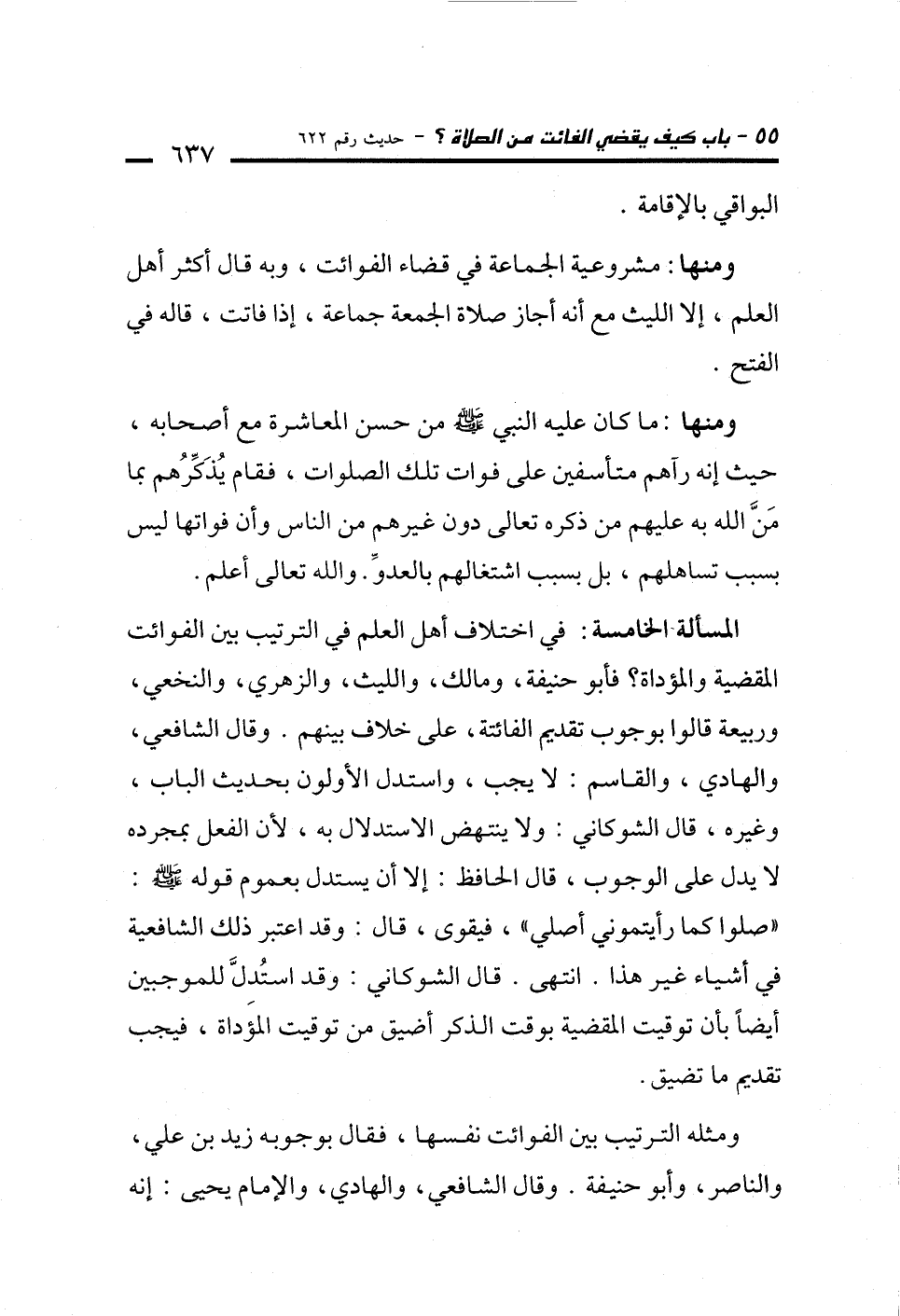 المسألة الخامسة: في اختلاف أهل العلم في الترتيب بين الفوائت المقضية والمؤداة؟ فأبو حنيفة، ومالك، والليث، والزهري، والنخعي، وربيعة قالوا بوجوب تقديم الفائتة، على خلاف بينهم. وقال الشافعي، والهادي، والقاسم: لا يجب، واستدل الأولون بحديث الباب، وغيره، قال الشوكاني: ولا ينتهض الاستدلال به، لأن الفعل بمجرده لا يدل على الوجوب، قال الحافظ: إلا أن يستدل بعموم قوله - صلى الله عليه وسلم -: "صلوا كما رأيتموني أصلي"، فيقوى، قال: وقد اعتبر ذلك الشافعية في أشياء غير هذا. انتهى. قال الشوكاني: وقد استُدِلَّ للموجبين أيضًا بأن توقيت المقضية بوقت الذكر أضيق من توقيت المؤداة، فيجب