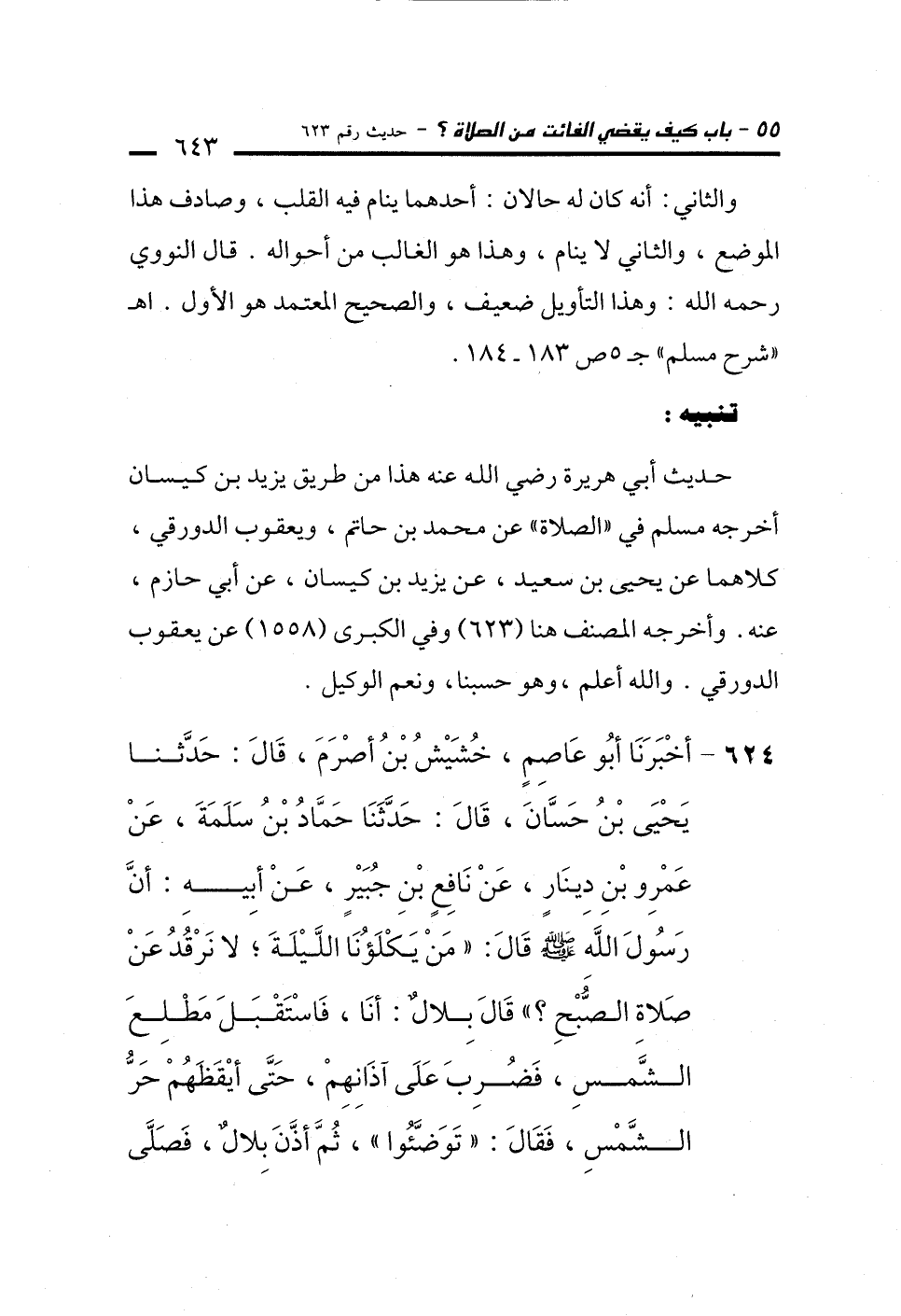 624 - أَخْبَرَنَا أَبُو عَاصِمٍ، خُشَيْشُ بْنُ أَصْرَمَ، قَالَ: حَدَّثَنَا يَحْيَى بْنُ حَسَّانَ، قَالَ: حَدَّثَنَا حَمَّادُ بْنُ سَلَمَةَ، عَنْ عَمْرِو بْنِ دِينَارٍ، عَنْ نَافِعِ بْنِ جُبَيْرٍ، عَنْ أَبِيهِ: أَنَّ رَسُولَ اللهِ - صلى الله عليه وسلم - قَالَ: "مَنْ يَكْلَؤُنَا اللَّيْلَةَ؛ لاَ نَرْقُدَ عَنْ صَلاَةِ الصُّبْحِ؟ ". قَالَ بِلاَلٌ: أَنَا، فَاسْتَقْبَلَ مَطْلَعَ الشَّمْسِ، فَضُرِبَ عَلَى آذَانِهِمْ، حَتَّى أَيْقَظَهُمْ حَرُّ الشَّمْسِ، فَقَالَ: "تَوَضَّئُوا"، ثُمَّ أَذَّنَ بِلاَلٌ، فَصَلَّى