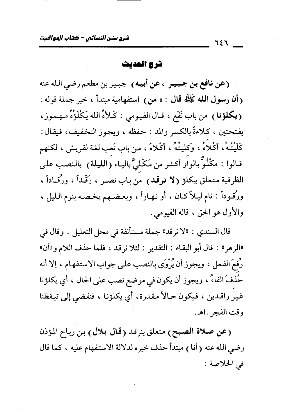 (عن نافع بن جبير، عن أبيه) جبير بن مطعم رضي الله عنه (أن رسول الله - صلى الله عليه وسلم - قال: من) استفهامية مبتدأ، خبر جملة قوله: (يكلؤنا) من باب نَفَع، قال الفيومي: كَلأهُ الله يَكْلَؤُهُ مهموز، بفتحتين، كِلاءةً بالكسر والمد: حفظه، ويجوز التخفيف، فيقال: كَلَيْتُهُ، أكْلاَهُ، وَكِليتُهُ، أكْلاهُ، من باب تَعِب لغة لقريش، لكنهم قالوا: مكْلُوٌّ بالواو أكثر من مَكْلِيٍّ بالياء (الليلة) بالنصب على الظرفية متعلق بيكلؤ (لا نرقد) من باب نصر، رَقْدًا، ورُقادًا، ورُقودًا: نام ليلًا كان، أو نهارًا، وبعضهم يخصه بنوم الليل، والأول هو الحق، قاله الفيومي.