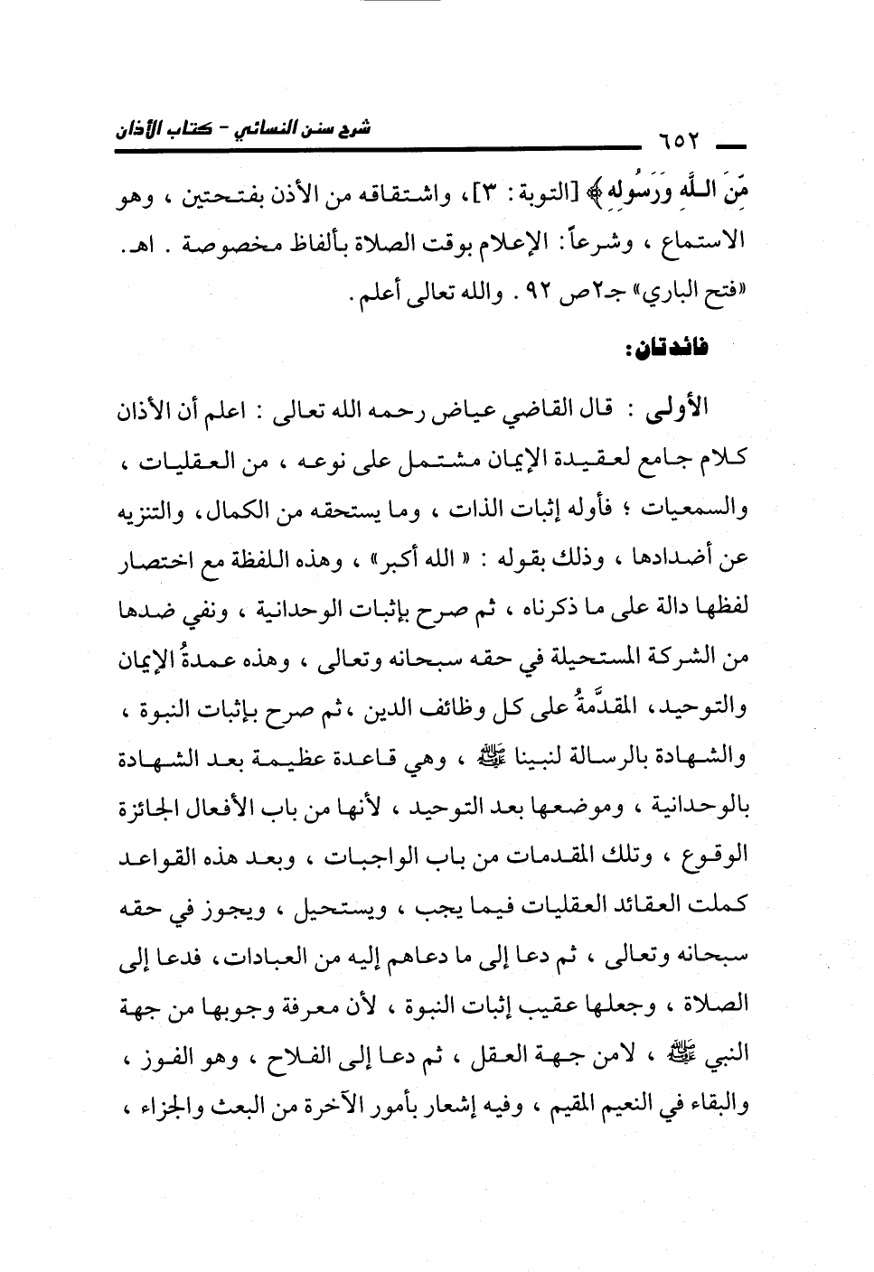 الأولى: قال القاضي عياض رحمه الله تعالى: اعلم أن الأذان كلام جامع لعقيدة الإيمان مشتمل على نوعه، من العقليات، والسمعيات؛ فأوله إثبات الذات، وما يستحقه من الكمال، والتنزيه عن أضدادها، وذلك بقوله: "الله أكبر"، وهذه اللفظة مع اختصار لفظها دالة على ما ذكرناه، ثم صرح بإثبات الوحدانية، ونفي ضدها من الشركة المستحيلة في حقه سبحانه وتعالى، وهذه عمدةُ الإيمان والتوحيد، المقدَّمةُ على كل وظائف الدين، ثم صرح بإثبات النبوة، والشهادة بالرسالة لنبينا - صلى الله عليه وسلم -، وهي قاعدة عظيمة بعد الشهادة بالوحدانية، وموضعها بعد التوحيد، لأنها من باب الأفعال الجائزة الوقوع، وتلك المقدمات من باب الواجبات، وبعد هذه القواعد كملت العقائد العقليات فيما يجب، ويستحيل، ويجوز في حقه سبحانه وتعالى، ثم دعا إلى ما دعاهم إليه من العبادات، فدعا إلى الصلاة، وجعلها عقيب إثبات النبوة، لأن معرفة وجوبها من جهة النبي - صلى الله عليه وسلم -، لا من جهة العقل، ثم دعا إلى الفلاح، وهو الفوز، والبقاء في النعيم المقيم، وفيه إشعار بأمور الآخرة من البعث والجزاء،