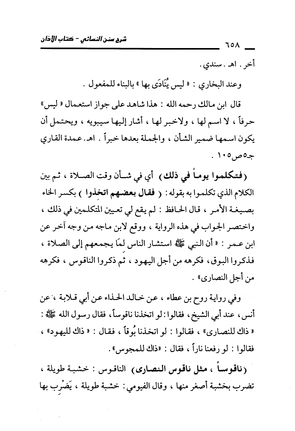 وفي رواية روح بن عطاء، عن خالد الحذاء عن أبي قلابة، عن أنس، عند أبي الشيخ، فقالوا: لو اتخذنا ناقوسًا، فقال رسول الله - صلى الله عليه وسلم -: "ذاك للنصارى"، فقالوا: لو اتخذنا بُوقًا، فقال: "ذاك لليهود"، فقالوا: لو رفعنا نارًا، فقال: "ذاك للمجوس".