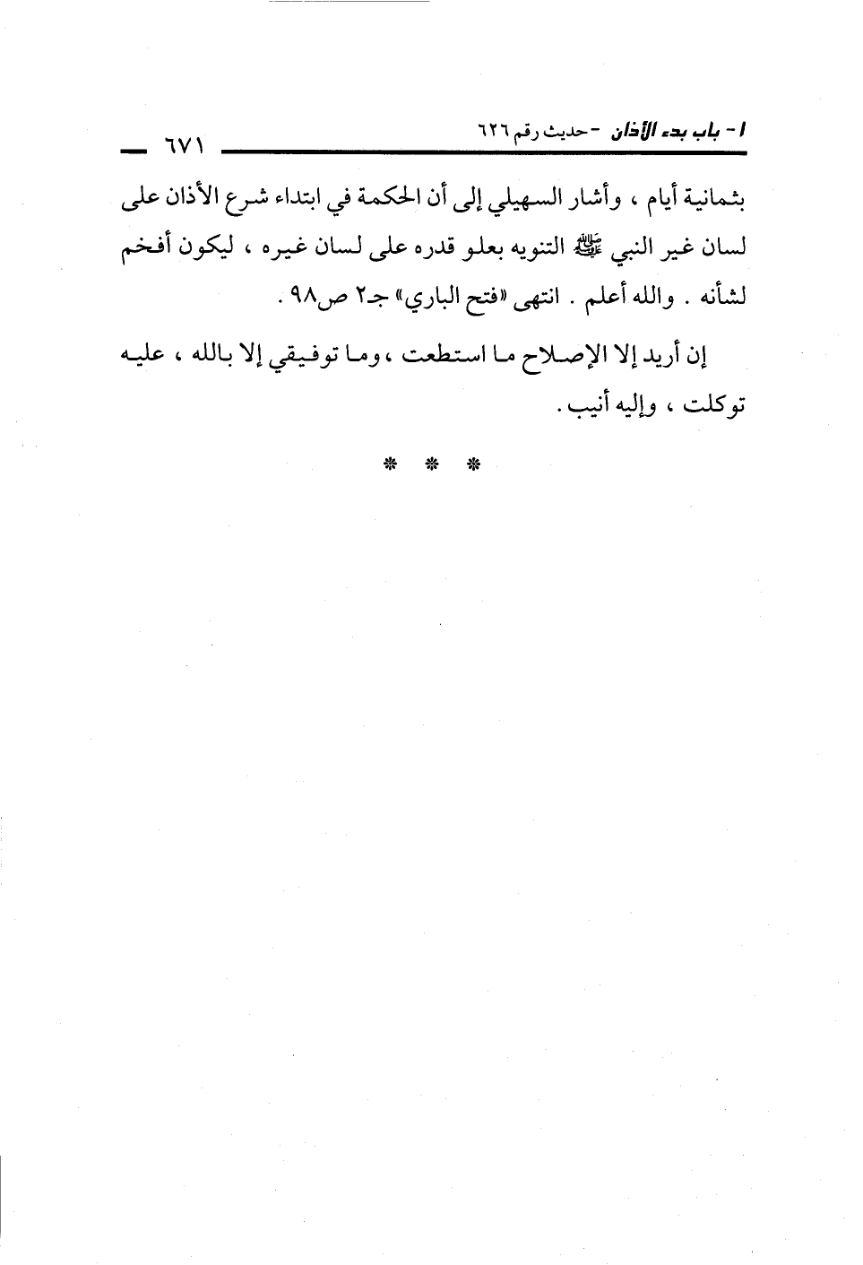 بثمانية أيام، وأشار السهيلي إلى أن الحكمة في ابتداء شرع الأذان على لسان غير النبي - صلى الله عليه وسلم - التنويه بعلو قدره على لسان غيره، ليكون أفخم لشأنه. والله أعلم. انتهى "فتح الباري" جـ 2 ص 98.