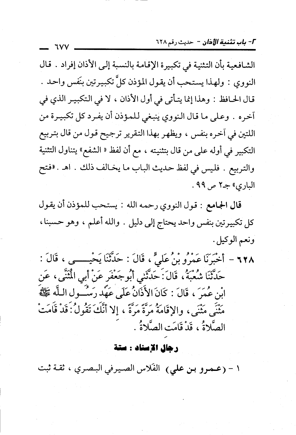 628 - أَخْبَرَنَا عَمْرُو بْنُ عَلِيٍّ، قَالَ: حَدَّثَنَا يَحْيَى، قَالَ: حَدَّثَنَا شُعْبَةُ، قَالَ: حَدَّثَنِي أَبُو جَعْفَرٍ عَنْ أَبِي الْمُثَنَّى، عَنِ ابْنِ عُمَرَ، قَالَ: كَانَ الأَذَانُ عَلَى عَهْدِ رَسُولِ اللهِ - صلى الله عليه وسلم - مَثْنَى مَثْنَى، وَالإِقَامَةُ مَرَّةً مَرَّةً، إِلاَّ أَنَّكَ تَقُولُ: قَدْ قَامَتِ الصَّلاَةُ، قَدْ قَامَتِ الصَّلاَةُ.