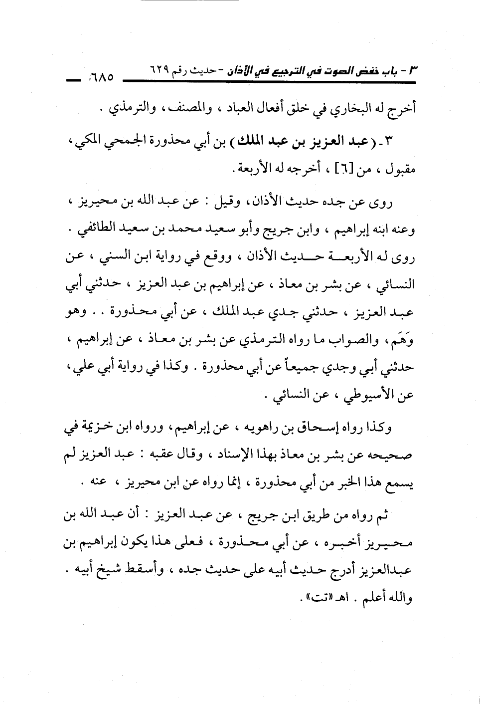 ثم رواه من طريق ابن جريج، عن عبد العزيز: أن عبد الله بن محيريز أخبره، عن أبي محذورة، فعلى هذا يكون إبراهيم بن عبد العزيز أدرج حديث أبيه على حديث جده، وأسقط شيخ أبيه. والله أعلم. اهـ "تت".