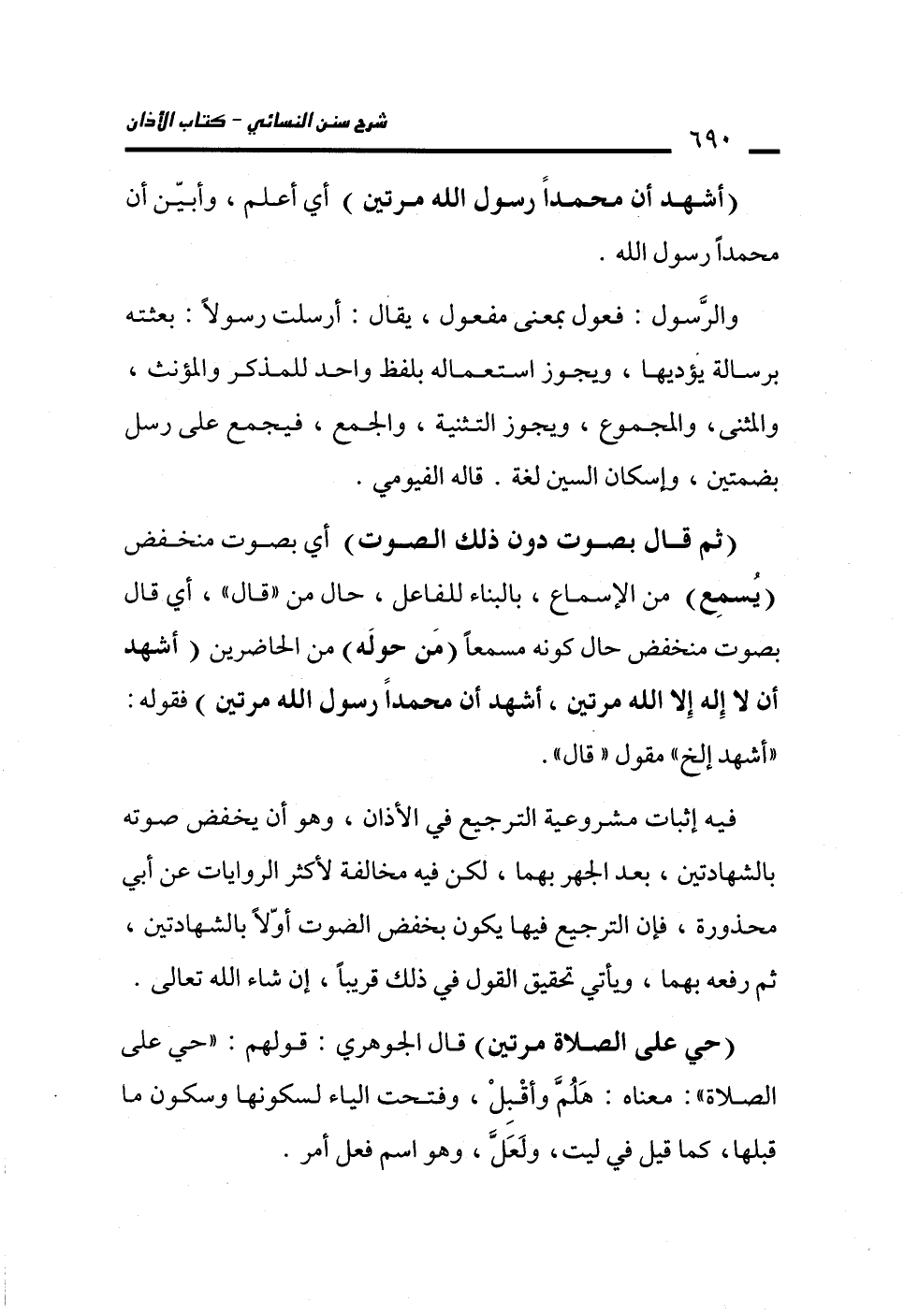 (حي على الصلاة مرتين) قال الجوهري: قولهم: "حي على الصلاة": معناه: هَلُمَّ وأقْبِلْ، وفتحت الياء لسكونها وسكون ما قبلها، كما قيل في ليت، ولَعَلَّ، وهو اسم فعل أمر.