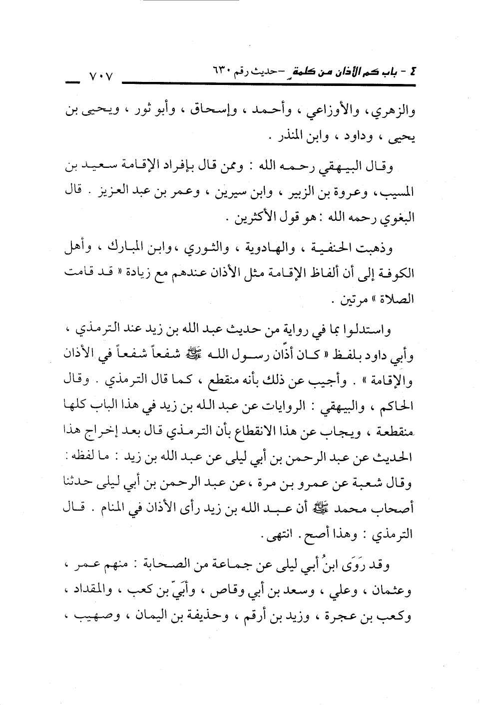 واستدلوا بما في رواية من حديث عبد الله بن زيد عند الترمذي، وأبي داود بلفظ "كان أذان رسول الله - صلى الله عليه وسلم - شفعًا شفعًا في الأذان والإقامة". وأجيب عن ذلك بأنه منقطع، كما قال الترمذي. وقال الحاكم، والبيهقي: الروايات عن عبد الله بن زيد في هذا الباب كلها منقطعة، ويجاب عن هذا الانقطاع بأن الترمذي قال بعد إخراج هذا الحديث عن عبد الرحمن بن أبي ليلى عن عبد الله بن زيد: ما لفظه: وقال شعبة عن عمرو بن مرة، عن عبد الرحمن بن أبي ليلى حدثنا أصحاب محمد - صلى الله عليه وسلم - أن عبد الله بن زيد رأى الأذان في المنام. قال الترمذي: وهذا أصح. انتهى.