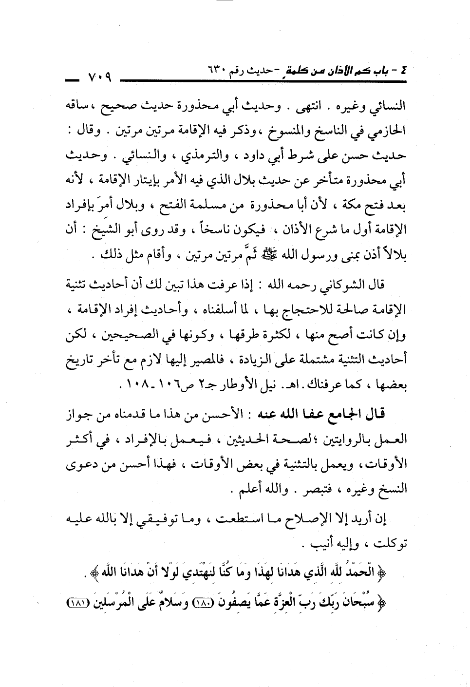 قال الشوكاني رحمه الله: إذا عرفت هذا تبين لك أن أحاديث تثنية الإقامة صالحة للاحتجاج بها، لما أسلفناه، وأحاديث إفراد الإقامة، وإن كانت أصح منها، لكثرة طرقها، وكونها في الصحيحين، لكن أحاديث التثنية مشتملة على الزيادة، فالمصير إليها لازم مع تأخر تاريخ بعضها، كما عرفناك. اهـ. نيل الأوطار جـ 2 ص 106 - 108.