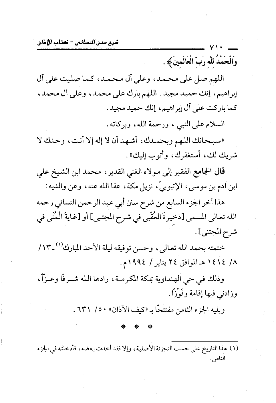 هذا آخر الجزء السابع من شرح سنن أبي عبد الرحمن النسائي رحمه الله تعالى المسمى [ذخِيرةَ العُقْبى في شرح المجتبى] أو [غايةَ الْمُنَى في شرح المجتنى].