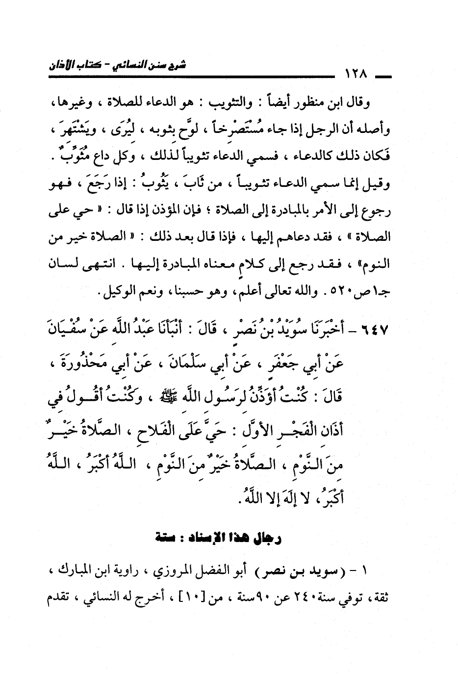 647 - أَخْبَرَنَا سُوَيْدُ بْنُ نَصْرٍ، قَالَ: أَنْبَأَنَا عَبْدُ اللهِ، عَنْ سُفْيَانَ، عَنْ أَبِي جَعْفَرٍ، عَنْ أَبِي سَلْمَانَ، عَنْ أَبِي مَحْذُورَةَ، قَالَ: كُنْتُ أُؤَذِّنُ لِرَسُولِ اللهِ - صلى الله عليه وسلم -، وَكُنْتُ أَقُولُ فِي أَذَانِ الْفَجْرِ الأَوَّلِ: حَيَّ عَلَى الْفَلاَحِ، الصَّلاَةُ خَيْرٌ مِنَ النَّوْمِ، الصَّلاَةُ خَيْرٌ مِنَ النَّوْمِ، اللَّهُ أَكْبَرُ، اللَّهُ أَكْبَرُ، لاَ إِلَهَ إِلاَّ اللَّهُ.