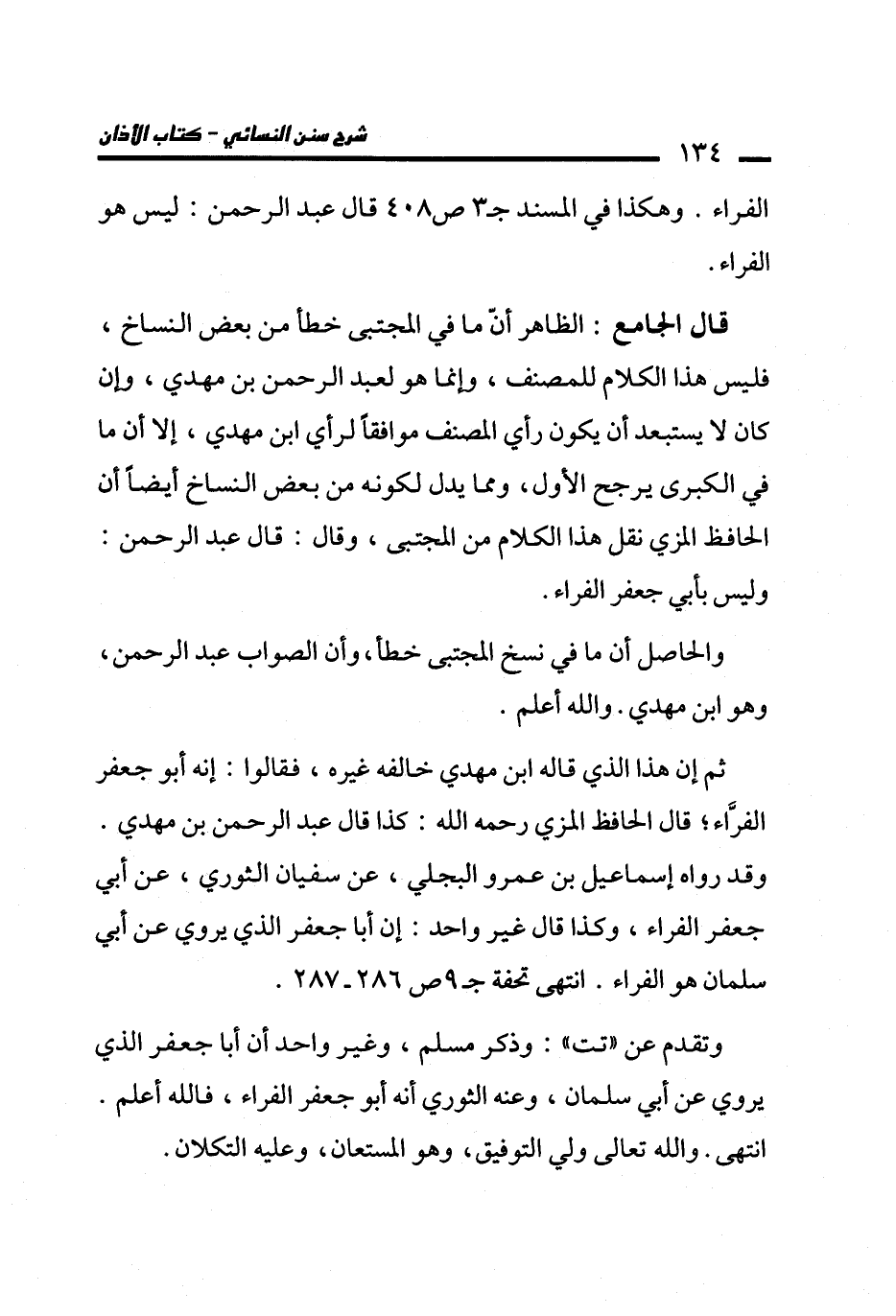 قال الجامع: الظاهر أنّ ما في المجتبى خطأ من بعض النساخ، فليس هذا الكلام للمصنف، وإنما هو لعبد الرحمن بن مهدي، وإن كان لا يستبعد أن يكون رأي المصنف موافقًا لرأي ابن مهدي، إلا أن ما في الكبرى يرجح الأول، ومما يدل لكونه من بعض النساخ أيضًا أن الحافظ المزي نقل هذا الكلام من المجتبى، وقال: قال عبد الرحمن: وليس بأبي جعفر الفراء.