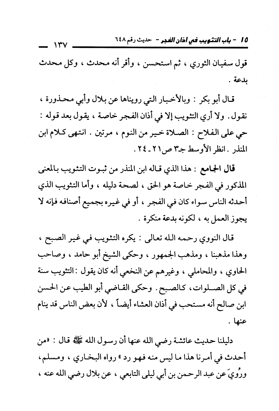 قال الجامع: هذا الذي قاله ابن المنذر من ثبوت التثويب بالمعنى المذكور في الفجر خاصة هو الحق، لصحة دليله، وأما التثويب الذي أحدثه الناس سواء كان في الفجر، أو في غيره بجميع أصنافه فإنه لا يجوز العمل به، لكونه بدعة منكرة.