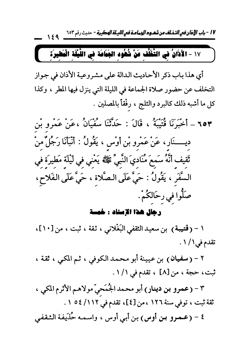 653 - أَخْبَرَنَا قُتَيْبَةُ، قَالَ: حَدَّثَنَا سُفْيَانُ، عَنْ عَمْرِو بْنِ دِينَارٍ، عَنْ عَمْرِو بْنِ أَوْسٍ، يَقُولُ: أَنْبَأَنَا رَجُلٌ مِنْ ثَقِيفٍ أَنَّهُ سَمِعَ مُنَادِيَ النَّبِيِّ - صلى الله عليه وسلم - يَعْنِي فِي لَيْلَةٍ مَطِيرَةٍ فِي السَّفَرِ، يَقُولُ: حَيَّ عَلَى الصَّلاَةِ، حَيَّ عَلَى الْفَلاَحِ، صَلُّوا فِي رِحَالِكُمْ.