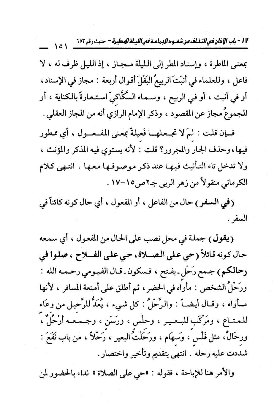 (يقول) جملة في محل نصب على الحال من المفعول، أي سمعه حال كونه قائلًا (حي على الصلاة، حي على الفلاح، صلوا في رحالكم) جمع رَحْلٍ -بفتح، فسكون- قال الفيومي رحمه الله: ورَحْلُ الشخص: مأواه في الحضر، ثم أطلق على أمتعة المسافر، لأنها مأواه، وقال أيضًا: والرَّحْلُ: كل شيء، يُعَدُّ للرَّحِيل من وِعَاءٍ للمتاع، ومَرْكَبٍ للبعير، وحِلْسٍ، ورَسَنٍ، وجمعه أرْحُلٌ، ورِحَالٌ، مثل فَلْسٍ، وَسِهَام، ورَحَلْتُ البعير، رَحْلًا، من باب نَفَعَ: شددت عليه رحله. انتهَى بتقديم وتأخير واختصار.