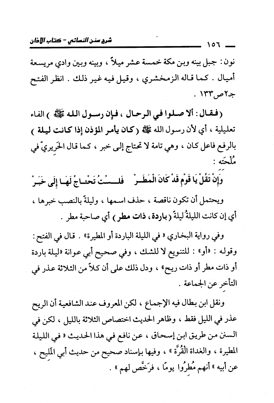 ونقل ابن بطال فيه الإجماع، لكن المعروف عند الشافعية أن الريح عذر في الليل فقط، وظاهر الحديث اختصاص الثلاثة بالليل، لكن في السنن من طريق ابن إسحاق، عن نافع في هذا الحديث "في الليلة المطيرة، والغداة الْقُرَّة"، وفيها بإسناد صحيح من حديث أبي المَلِيح، عن أبيه "أنهم مُطِرُوا يومًا، فرَخَّص لهم".