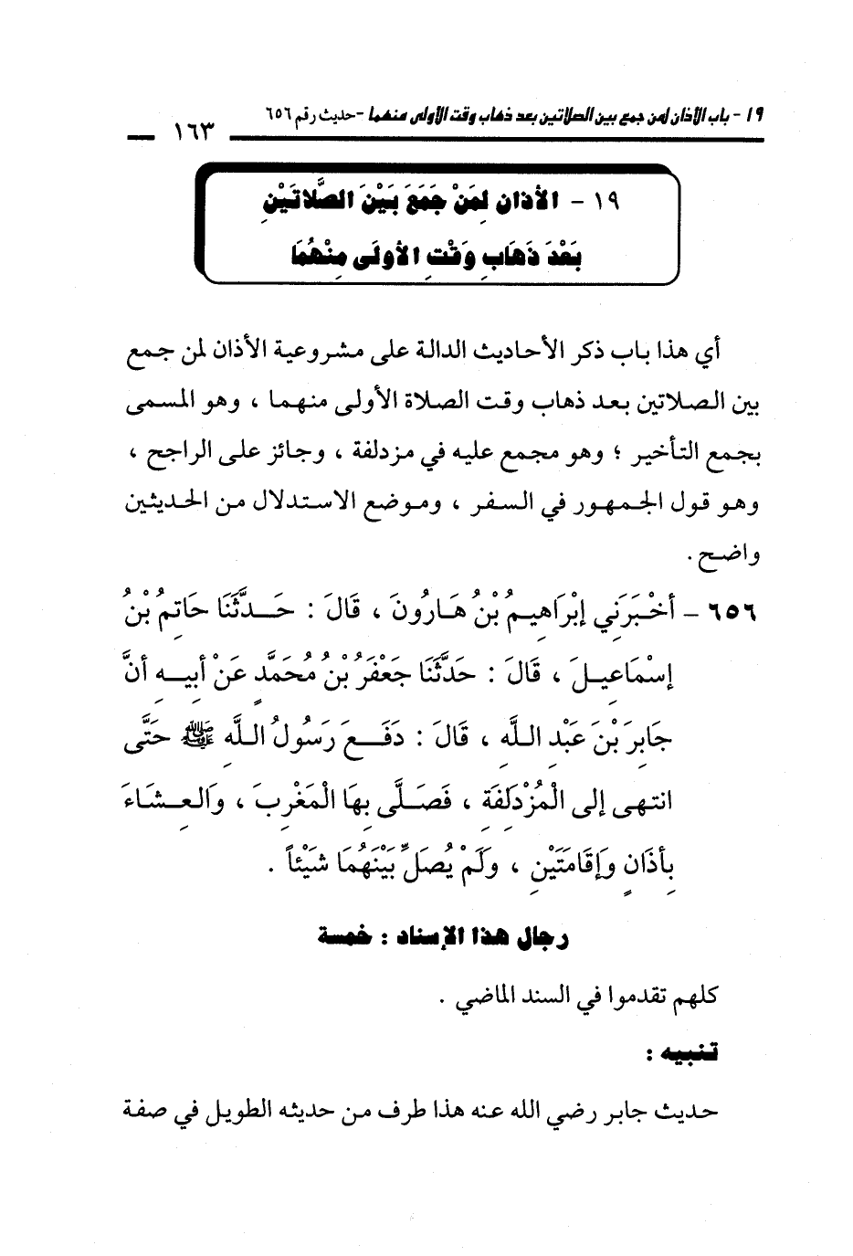 656 - أَخْبَرَنِي إِبْرَاهِيمُ بْنُ هَارُونَ، قَالَ: حَدَّثَنَا حَاتِمُ بْنُ إِسْمَاعِيلَ، قَالَ: حَدَّثَنَا جَعْفَرُ بْنُ مُحَمَّدٍ عَنْ أَبِيهِ أَنَّ جَابِرَ بْنَ عَبْدِ اللهِ، قَالَ: دَفَعَ رَسُولُ اللهِ - صلى الله عليه وسلم - حَتَّى انْتَهَى إِلَى الْمُزْدَلِفَةِ، فَصَلَّى بِهَا الْمَغْرِبَ، وَالْعِشَاءَ بِأَذَانٍ وَإِقَامَتَيْنِ، وَلَمْ يُصَلِّ بَيْنَهُمَا شَيْئًا.