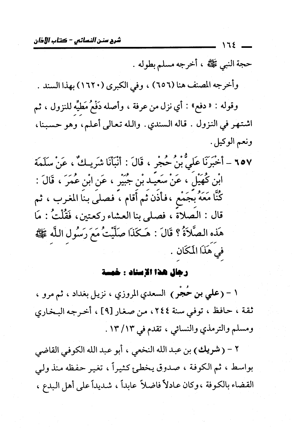 657 - أَخْبَرَنَا عَلِيُّ بْنُ حُجْرٍ، قَالَ: أَنْبَأَنَا شَرِيكٌ، عَنْ سَلَمَةَ بْنِ كُهَيْلٍ، عَنْ سَعِيدِ بْنِ جُبَيْرٍ، عَنِ ابْنِ عُمَرَ، قَالَ: كُنَّا مَعَهُ بِجَمْعٍ، فَأَذَّنَ ثُمَّ أَقَامَ، فَصَلَّى بِنَا الْمَغْرِبَ، ثُمَّ قَالَ: الصَّلاَةَ، فَصَلَّى بِنَا الْعِشَاءَ رَكْعَتَيْنِ، فَقُلْتُ: مَا هَذِهِ الصَّلاَةُ؟ قَالَ: هَكَذَا صَلَّيْتُ مَعَ رَسُولِ اللهِ - صلى الله عليه وسلم - فِي هَذَا الْمَكَانِ.