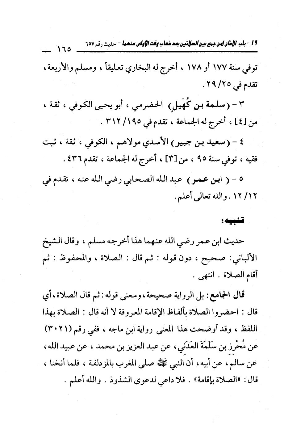 قال الجامع: بل الرواية صحيحة، ومعنى قوله: ثم قال الصلاة، أي قال: احضروا الصلاة بألفاظ الإقامة المعروفة لا أنه قال: الصلاة بهذا اللفظ، وقد أوضحت هذا المعنى رواية ابن ماجه، ففي رقم (3021) عن مُحْرِزِ بن سَلَمَةَ العَدَنِي، عن عبد العزيز بن محمد، عن عبيد الله، عن سالم، عن أبيه، أن النبي - صلى الله عليه وسلم - صلى المغرب بالمزدلفة، فلما أنخنا، قال: "الصلاة بإقامة". فلا داعي لدعوى الشذوذ. والله أعلم.