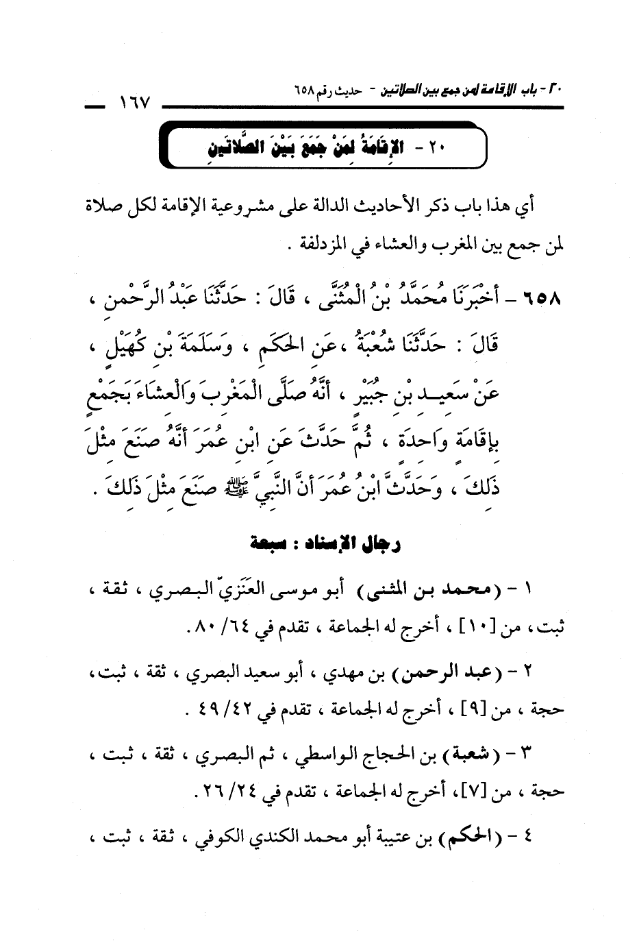 658 - أَخْبَرَنَا مُحَمَّدُ بْنُ الْمُثَنَّى، قَالَ: حَدَّثَنَا عَبْدُ الرَّحْمَنِ، قَالَ: حَدَّثَنَا شُعْبَةُ، عَنِ الْحَكَمِ، وَسَلَمَةِ بْنِ كُهَيْلٍ، عَنْ سَعِيدِ بْنِ جُبَيْرٍ، أَنَّهُ صَلَّى الْمَغْرِبَ وَالْعِشَاءَ بِجَمْعٍ بِإِقَامَةٍ وَاحِدَةٍ، ثُمَّ حَدَّثَ عَنِ ابْنِ عُمَرَ أَنَّهُ صَنَعَ مِثْلَ ذَلِكَ، وَحَدَّثَ ابْنُ عُمَرَ أَنَّ النَّبِيَّ - صلى الله عليه وسلم - صَنَعَ مِثْلَ ذَلِكَ.