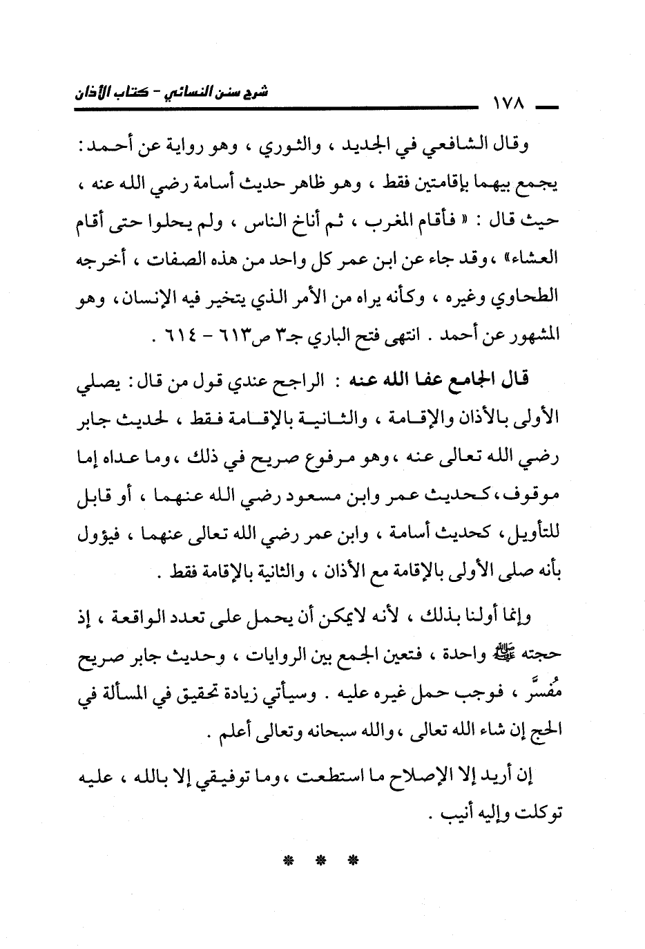وقال الشافعي في الجديد، والثوري، وهو رواية عن أحمد: يجمع بينهما بإقامتين فقط، وهو ظاهر حديث أسامة رضي الله عنه، حيث قال: "فأقام المغرب، ثم أناخ الناس، ولم يحلوا حتى أقام العشاء"، وقد جاء عن ابن عمر كل واحد من هذه الصفات، أخرجه الطحاوي وغيره، وكأنه يراه من الأمر الذي يتخير فيه الإنسان، وهو المشهور عن أحمد. انتهى فتح الباري جـ 3 ص 613 - 614.