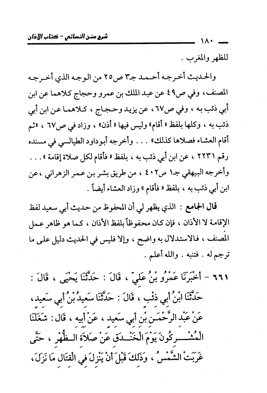 قال الجامع: الذي يظهر لي أن المحفوظ من حديث أبي سعيد لفظ الإقامة لا الأذان، فإن كان محفوظًا بلفظ الأذان، كما هو ظاهر عمل المصنف، فالاستدلال به واضح، وإلا فليس في الحديث دليل على ما ترجم له. فتنبه. والله أعلم.