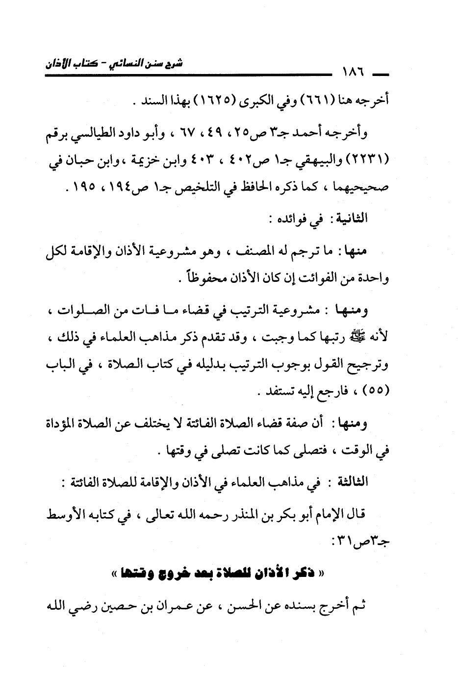 ومنها: مشروعية الترتيب في قضاء ما فات من الصلوات، لأنه - صلى الله عليه وسلم - رتبها كما وجبت، وقد تقدم ذكر مذاهب العلماء في ذلك، وترجيح القول بوجوب الترتيب بدليله في كتاب الصلاة، في الباب (55)، فارجع إليه تستفد.