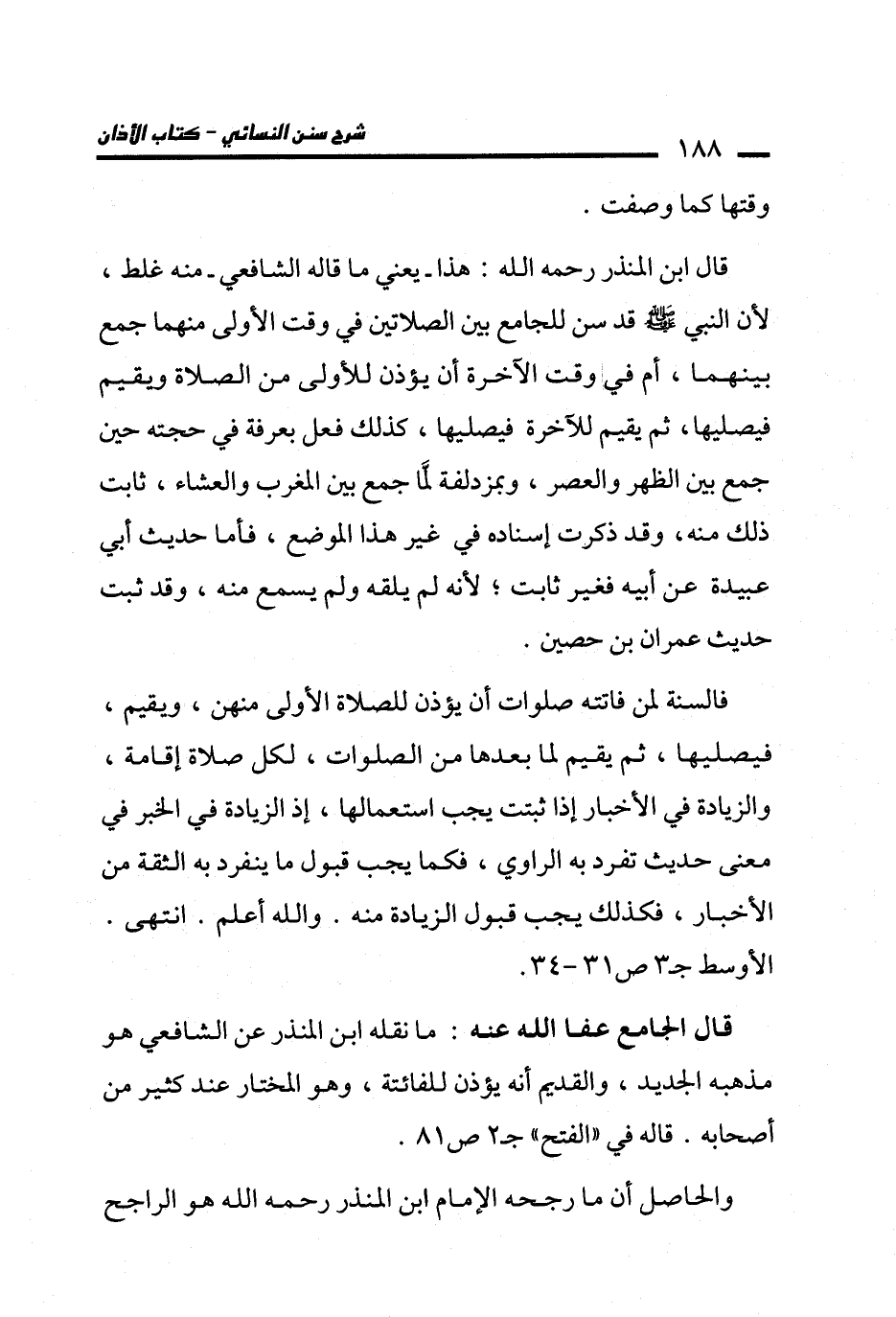 قال ابن المنذر رحمه الله: هذا -يعني ما قاله الشافعي- منه غلط، لأن النبي - صلى الله عليه وسلم - قد سن للجامع بين الصلاتين في وقت الأولى منهما جمع بينهما، أم في وقت الآخرة أن يؤذن للأولى من الصلاة ويقيم فيصليها، ثم يقيم للآخرة فيصليها، كذلك فعل بعرفة في حجته حين جمع بين الظهر والعصر، وبمزدلفة لمَّا جمع بين المغرب والعشاء، ثابت ذلك منه، وقد ذكرت إسناده في غير هذا الموضع، فأما حديث أبي عبيدة عن أبيه فغير ثابت؛ لأنه لم يلقه ولم يسمع منه، وقد ثبت حديث عمران بن حصين.