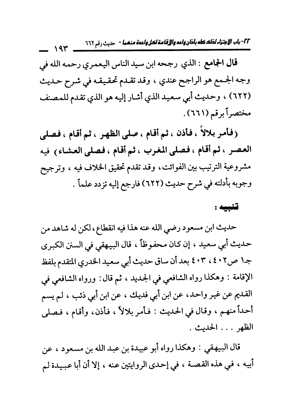 قال الجامع: الذي رجحه ابن سيد الناس اليعمري رحمه الله في وجه الجمع هو الراجح عندي، وقد تقدم تحقيقه في شرح حديث (622)، وحديث أبي سعيد الذي أشار إليه هو الذي تقدم للمصنف مختصرًا برقم (661).
