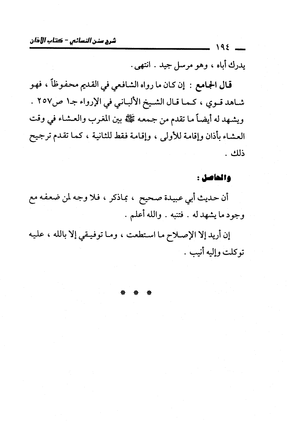 قال الجامع: إن كان ما رواه الشافعي في القديم محفوظًا، فهو شاهد قوي، كما قال الشيخ الألباني في الإرواء جـ 1 ص 257. ويشهد له أيضًا ما تقدم من جمعه - صلى الله عليه وسلم - بين المغرب والعشاء في وقت العشاء بأذان وإقامة للأولى، وإقامة فقط للثانية، كما تقدم ترجيح ذلك.