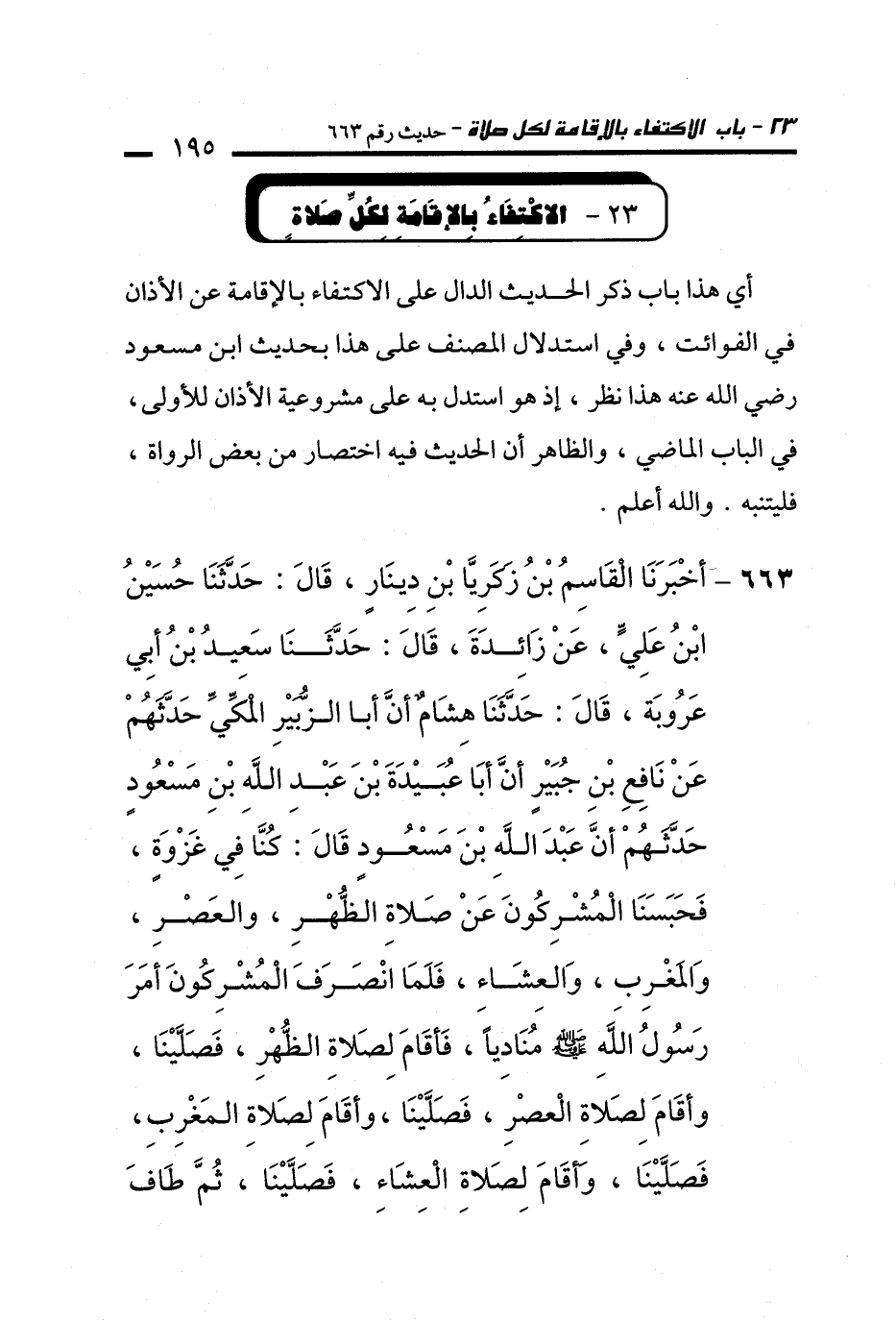 23 - الاكْتِفَاءُ بِالإقَامَةِ لِكُلِّ صَلاةٍ