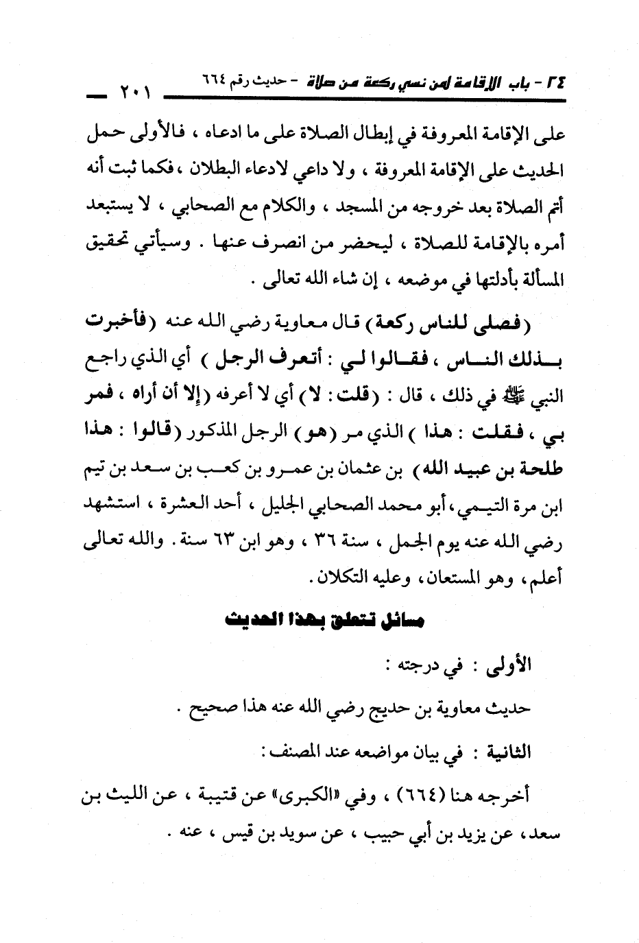 (فصلى للناس ركعة) قال معاوية رضي الله عنه (فأخبرت بذلك الناس، فقالوا لي: أتعرف الرجل) أي الذي راجع النبي - صلى الله عليه وسلم - في ذلك، قال: (قلت: لا) أي لا أعرفه (إِلا أن أراه، فمر بي، فقلت: هذا) الذي مر (هو) الرجل المذكور (قالوا: هذا طلحة بن عبيد الله) بن عثمان بن عمرو بن كعب بن سعد بن تيم ابن مرة التيمي، أبو محمد الصحابي الجليل، أحد العشرة، استشهد رضي الله عنه يوم الجمل، سنة 36، وهو ابن 63 سنة. والله تعالى أعلم، وهو المستعان، وعليه التكلان.