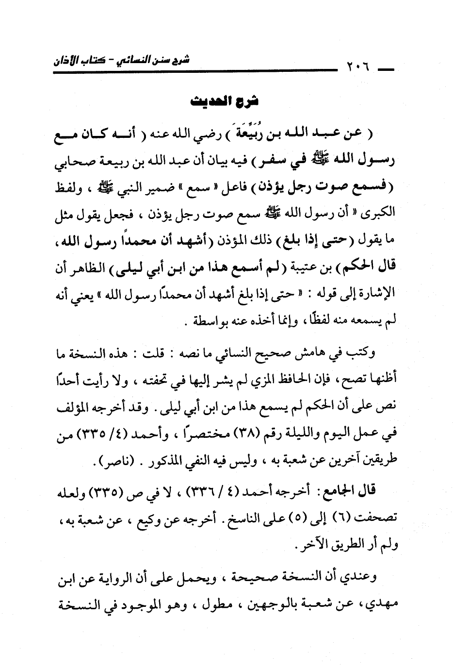 وكتب في هامش صحيح النسائي ما نصه: قلت: هذه النسخة ما أظنها تصح، فإن الحافظ المزي لم يشر إليها في تحفته، ولا رأيت أحدًا نص على أن الحكم لم يسمع هذا من ابن أبي ليلى. وقد أخرجه المؤلف في عمل اليوم والليلة رقم (38) مختصرًا، وأحمد (4/ 335) من طريقين آخرين عن شعبة به، وليس فيه النفي المذكور. (ناصر).