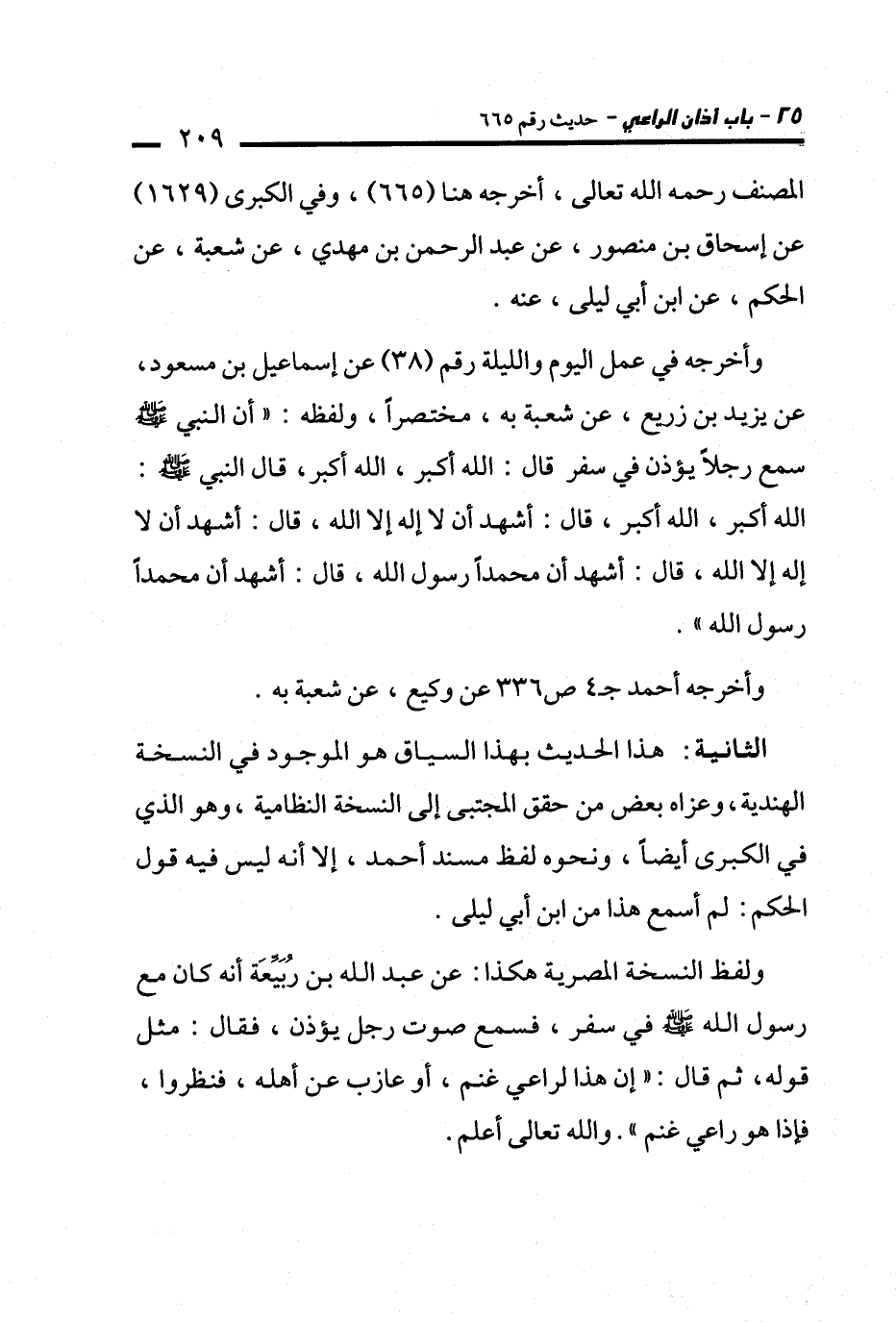 ولفظ النسخة المصرية هكذا: عن عبد الله بن رُبَيِّعَة أنه كان مع رسول الله - صلى الله عليه وسلم - في سفر، فسمع صوت رجل يؤذن، فقال: مثل قوله، ثم قال: "إن هذا لراعي غنم، أو عازب عن أهله، فنظروا، فإذا هو راعي غنم". والله تعالى أعلم.