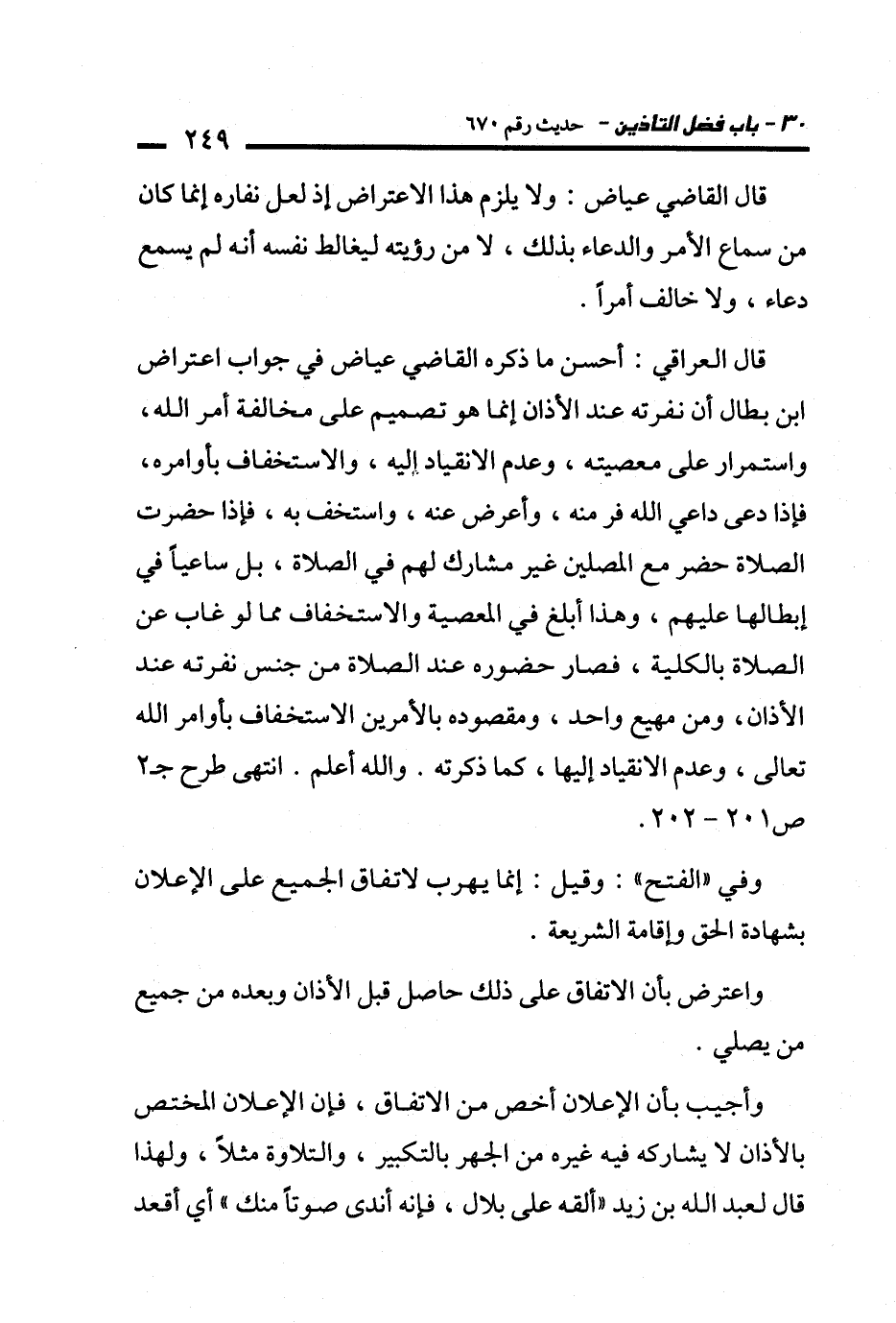 قال العراقي: أحسن ما ذكره القاضي عياض في جواب اعتراض ابن بطال أن نفرته عند الأذان إنما هو تصميم على مخالفة أمر الله، واستمرار على معصيته، وعدم الانقياد إليه، والاستخفاف بأوامره، فإذا دعى داعي الله فر منه، وأعرض عنه، واستخف به، فإذا حضرت الصلاة حضر مع المصلين غير مشارك لهم في الصلاة، بل ساعيًا في إبطالها عليهم، وهذا أبلغ في المعصية والاستخفاف مما لو غاب عن الصلاة بالكلية، فصار حضوره عند الصلاة من جنس نفرته عند الأذان، ومن مهيع واحد، ومقصوده بالأمرين الاستخفاف بأوامر الله تعالى، وعدم الانقياد إليها، كما ذكرته. والله أعلم. انتهى طرح جـ 2 ص 201 - 202.