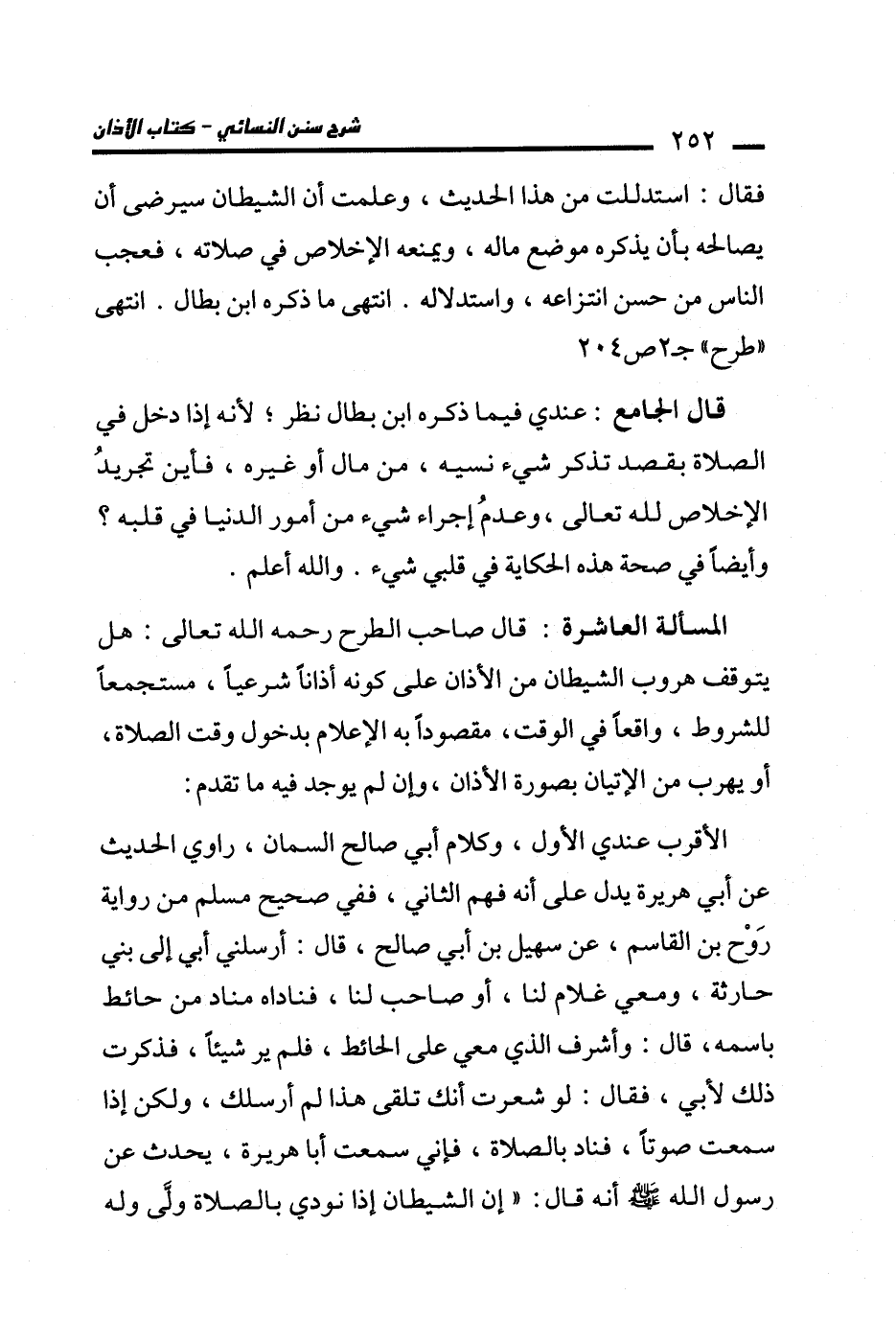 المسألة العاشرة: قال صاحب الطرح رحمه الله تعالى: هل يتوقف هروب الشيطان من الأذان على كونه أذانًا شرعيًا، مستجمعًا للشروط، واقعًا في الوقت، مقصودًا به الإعلام بدخول وقت الصلاة، أو يهرب من الإتيان بصورة الأذان، وإن لم يوجد فيه ما تقدم: